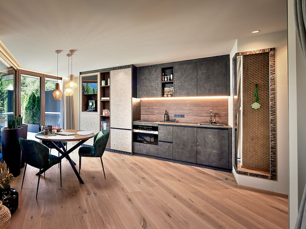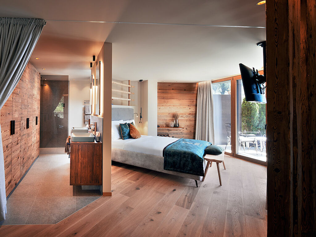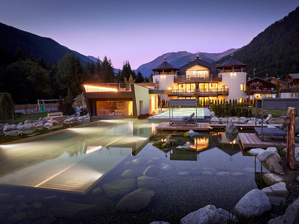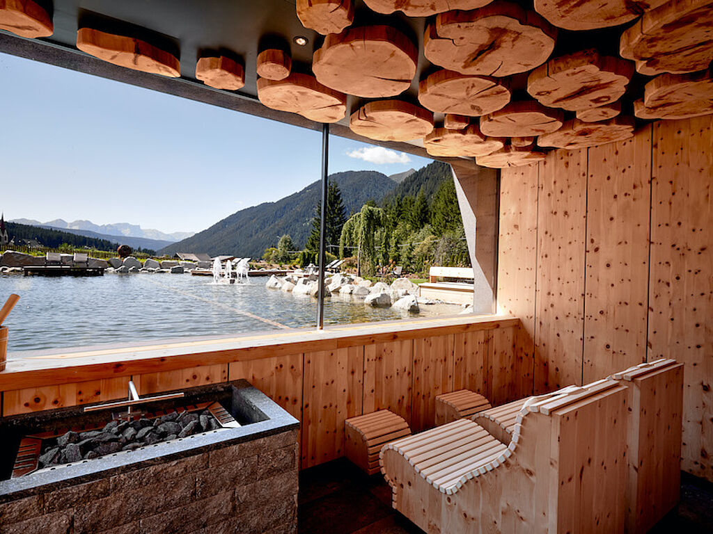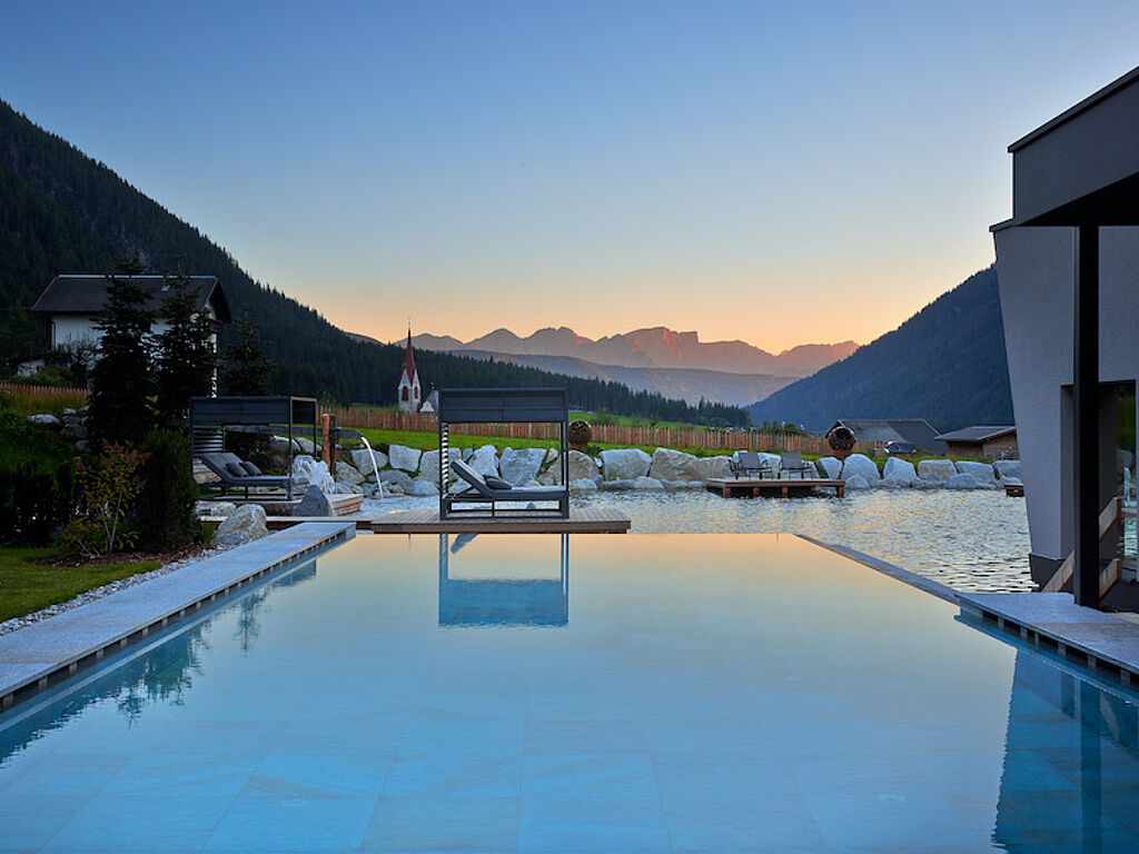 Im ganzjährig ökologisch beheizten »Dolomites-Infinity-Outdoorpool« hat man das Gefühl, direkt in den Himmel zu schwimmen, der sich im Wasser spiegelt. Jede einzelne Luxussuite mit überdachter Outdoorterrasse verfügt über eine private Liege- und Relaxlounge mit Einstieg zum Biobadesee mit seinem reinen Bergquellwasser.