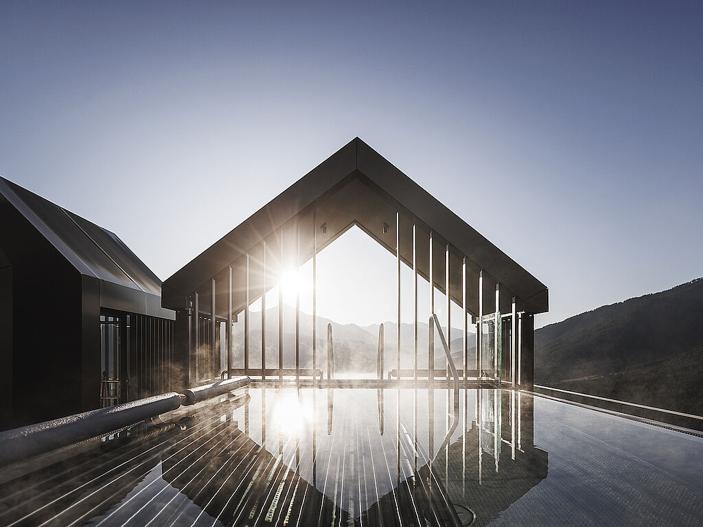 Spektakulär ist der neue SKY POOL: Keine sichtbaren Grenzen, nur durchsichtiges Glas: So präsentiert sich der Outdoor-Pool (30°). Mit 25 Meter Länge fügt sich das außergewöhnliche Schwimmbad harmonisch in die einzigartige Wasserwelt des Hubertus ein.