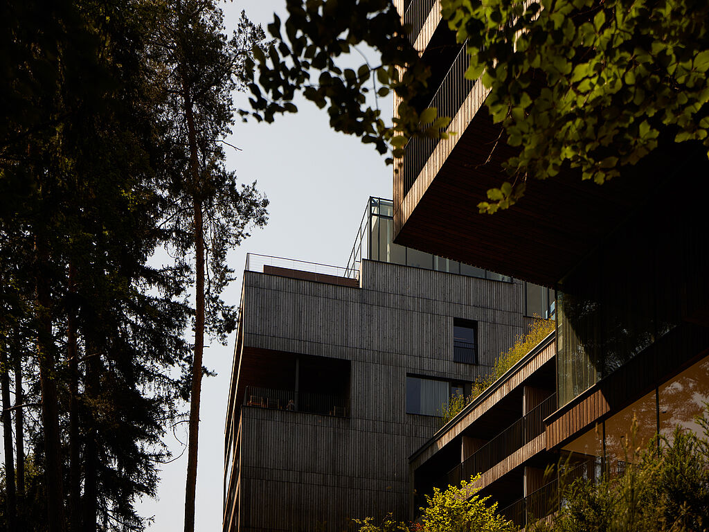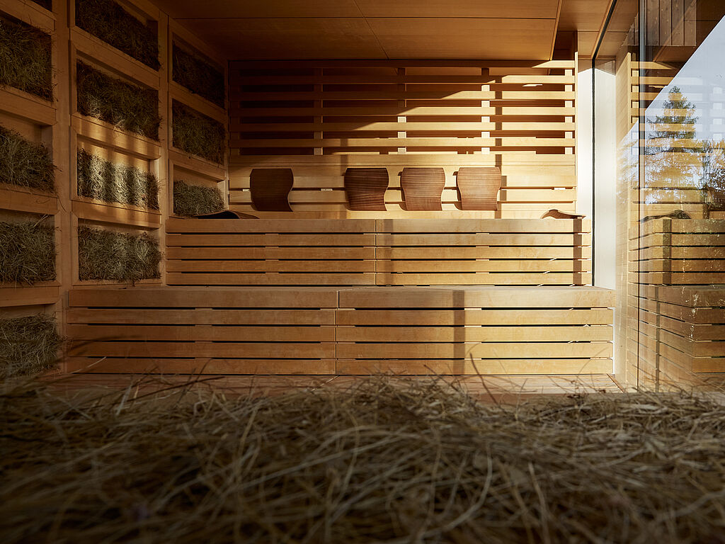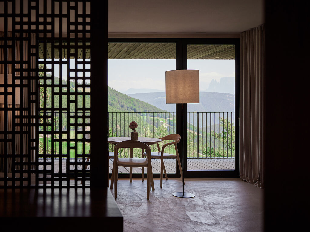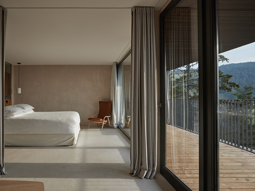 Bereits beim Bau wurde auf die besondere Dynamik zwischen Natur und Architektur wert gelegt. Entstanden ist ein Gebäude aus heimischen Baumaterialien wie Lärchenholz, Bienenwachs und rotem Porphyr, das sich als Rahmen für das Kunstwerk Natur versteht. Auch in den Zimmern und Suiten wurde ans Wesentliche gedacht. Ein offenes Ambiente, verspielte Rückzugsorte, warme Naturmaterialien wie Kalk und Lehm, wertvolle Hölzer und Bienenwachsversiegelungen schaffen ein gesundes und behagliches Raumklima.