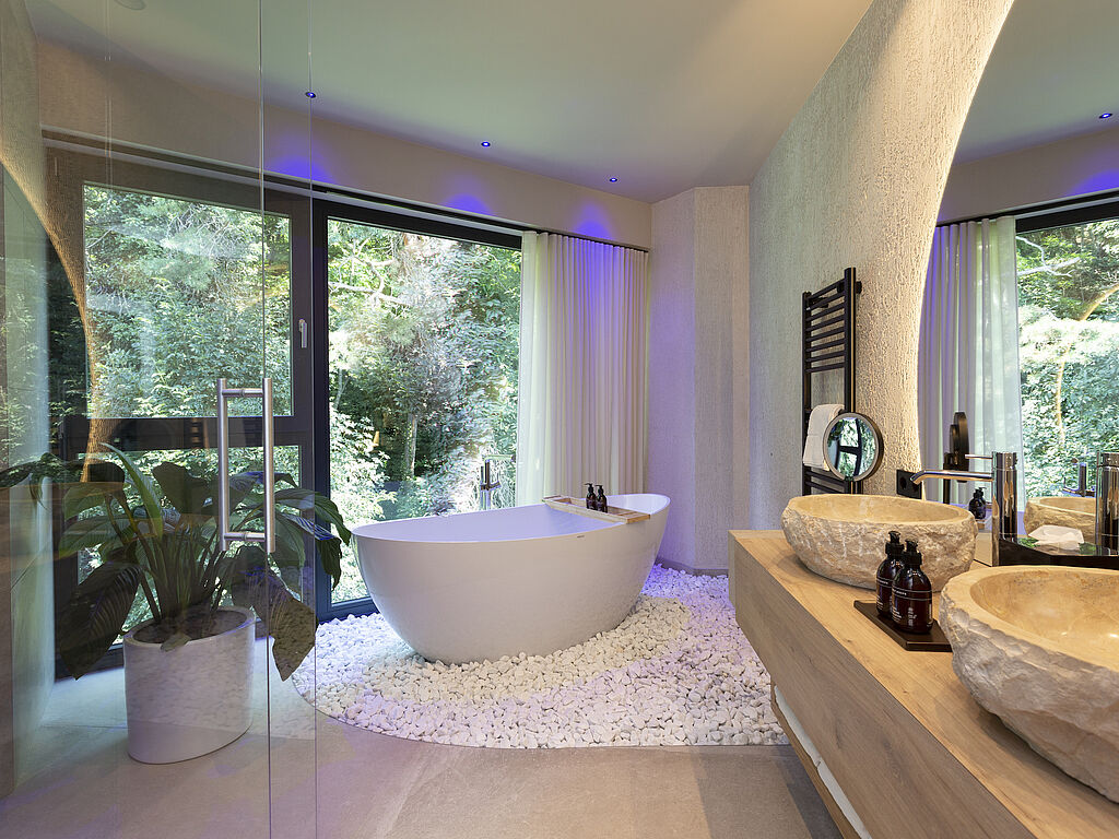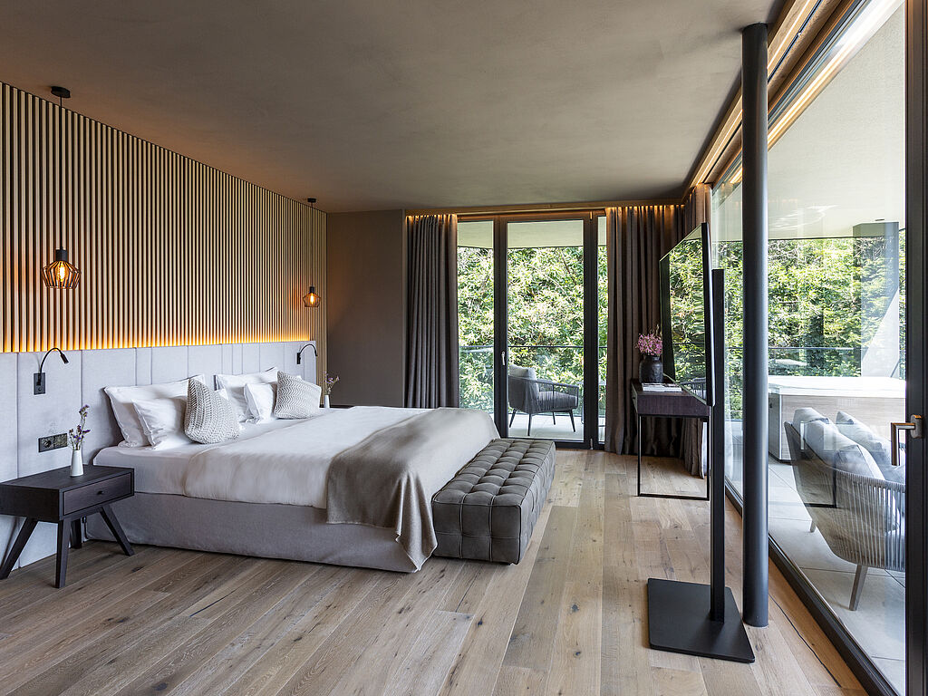 In den hellen, zwischen 37 und 63 Quadratmeter großen, neuen Suiten des AVIDEA vereinen sich heimische Naturmaterialien stimmig mit einem modernen und schnörkellosen Design. So sind die Zimmer mit hochwertigen Naturholzböden ausgestattet und öffnen sich auf einen Balkon oder eine Terrasse aus Glas. Teilweise verfügen die Suiten über ein privates Spa, eine Whirlwanne im Freien oder eigenen kleinen Rückzugsort im Grünen. Die Natur ist nicht nur ständiger Begleiter, sondern zugleich Designvorbild - auch in den öffentlichen Bereichen, welche in Naturfarben und warmen Grüntönen gestaltet sind.