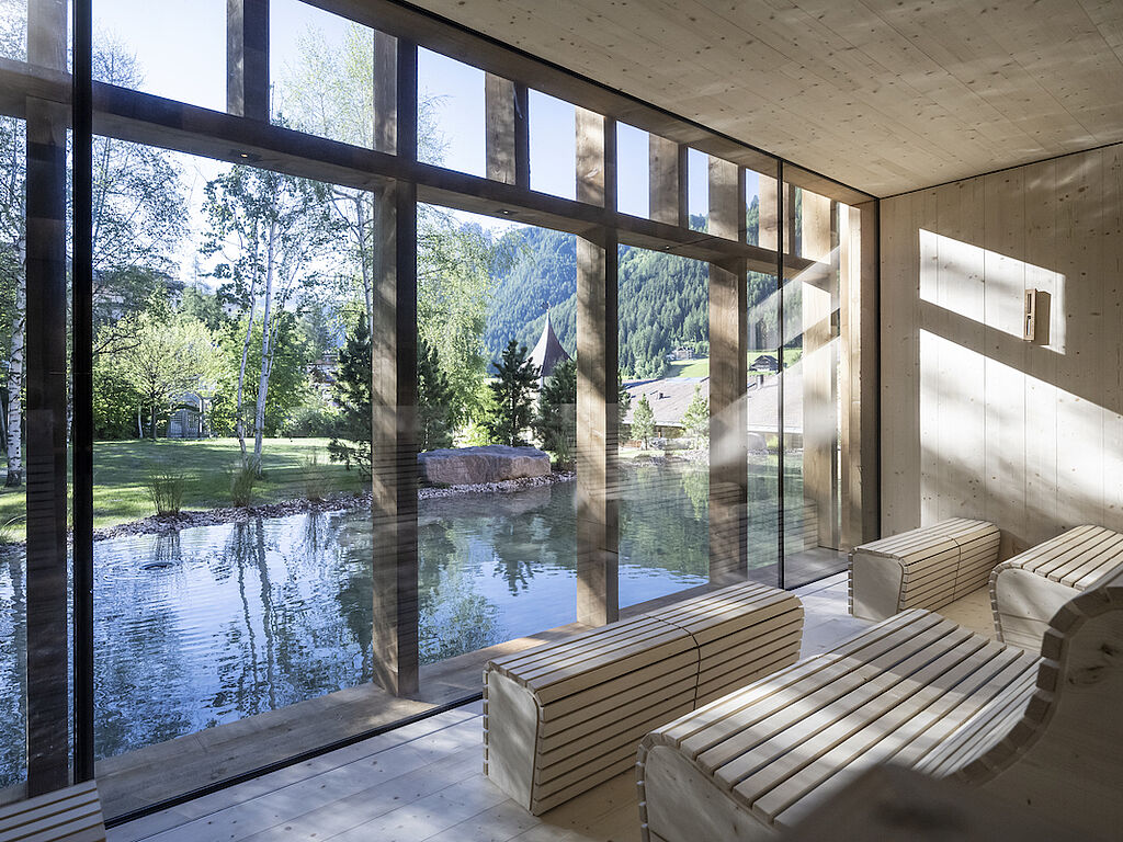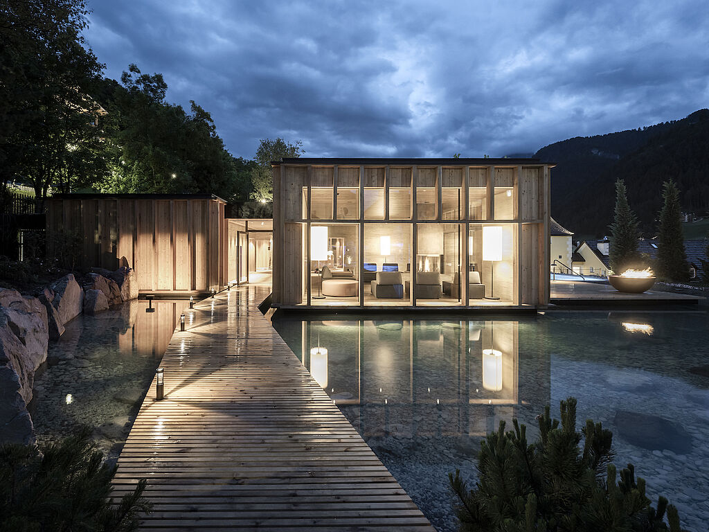 Zu der bereits bestehenden Wellnesswelt mit Pools und Saunen gesellt sich seit 2022 ein weiterer, in der großzügigen Gartenanlage liebevoll integrierter Outdoor-Saunabereich: Wie eine Insel im Wasser stehen die neuen Saunen auf einer Plattform. Ihre zeitgemäße schlichte Ästhetik unterstreicht in Verbindung mit hochwertigen Naturmaterialien wie Holz, Stein und Stampflehm den Bezug zur Natur.