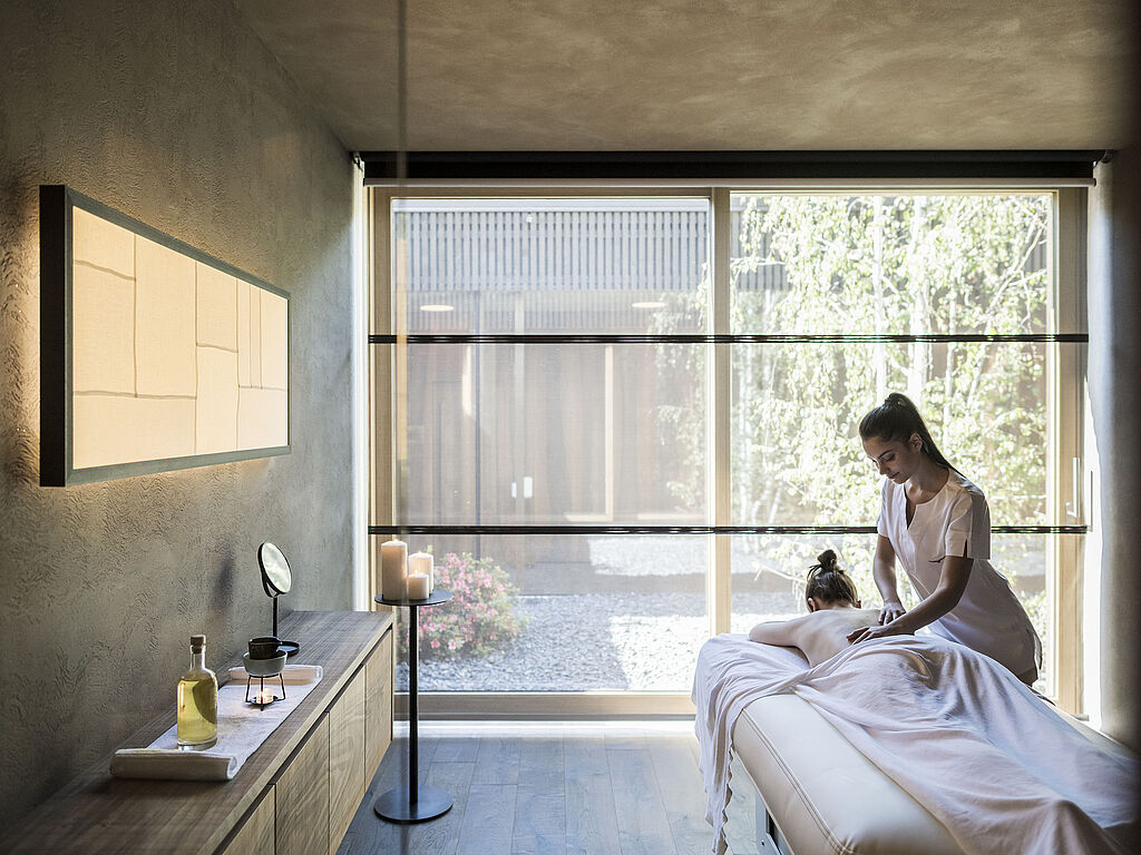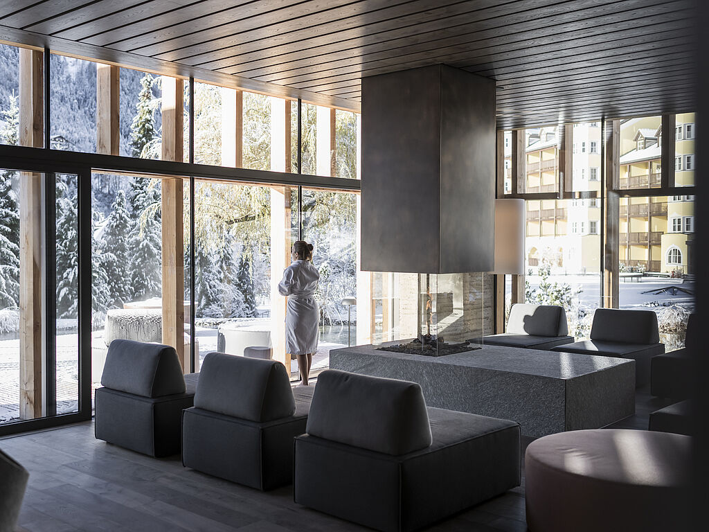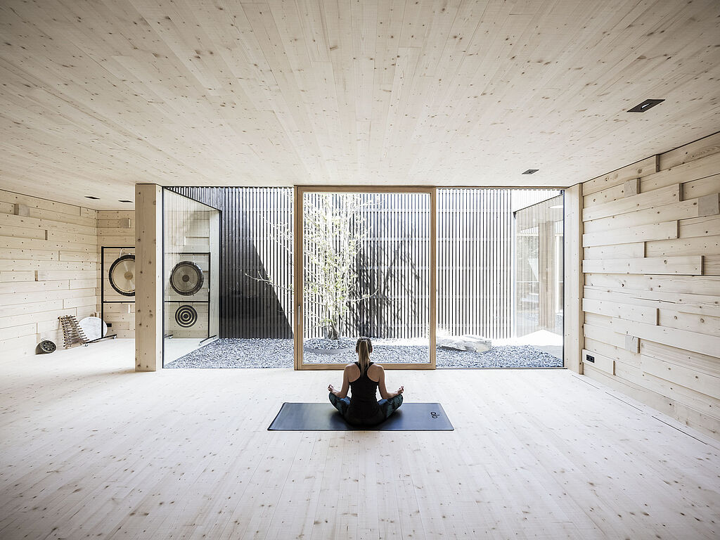 Auf 4 000 m² bietet die Wellnesswelt Platz für ganzheitliche Regeneration. Seit 2021 finden die Gäste einen neuen Spa-Bereich mit einem einzigartigen Open Space vor. Ein exklusives Ambiente, in dem man sich vor und nach den Behandlungen entspannen kann. Von Ayurveda über zahlreiche internationale Behandlungen bis hin zur Tiroler Arnika-Fangopackung wird ein großes Spa-Angebot offeriert. Die neuen Spa-Kabinen befinden sich am Ende einer Passage, die mit Hölzern aus der Region ausgekleidet ist und in einen lichterfüllten Raum mündet, der auf zwei Innengärten blickt. Ein weiteres Highlight: ein Yoga-Pavillon aus heimischem Fichtenholz, der ausschließlich der Meditation dient.