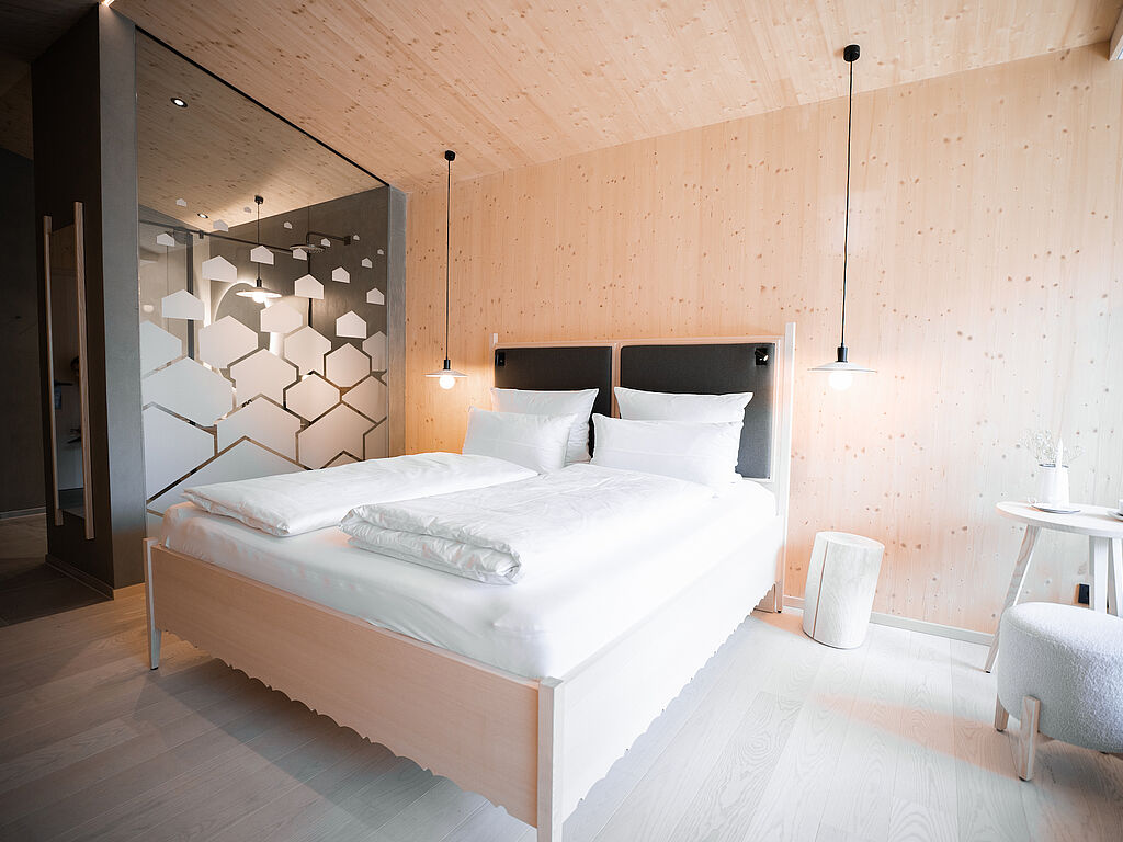Benannt nach dem Montafoner Steinschaf, nächtigt man hier im "Schafgemach". Ausgestattet mit kuscheligen Doppelbetten, offenem Bad mit Regendusche, Leseecke und einem großen Balkon oder Terrasse mit traumhaftem Bergblick, sind sie behagliche Orte der Ruhe.