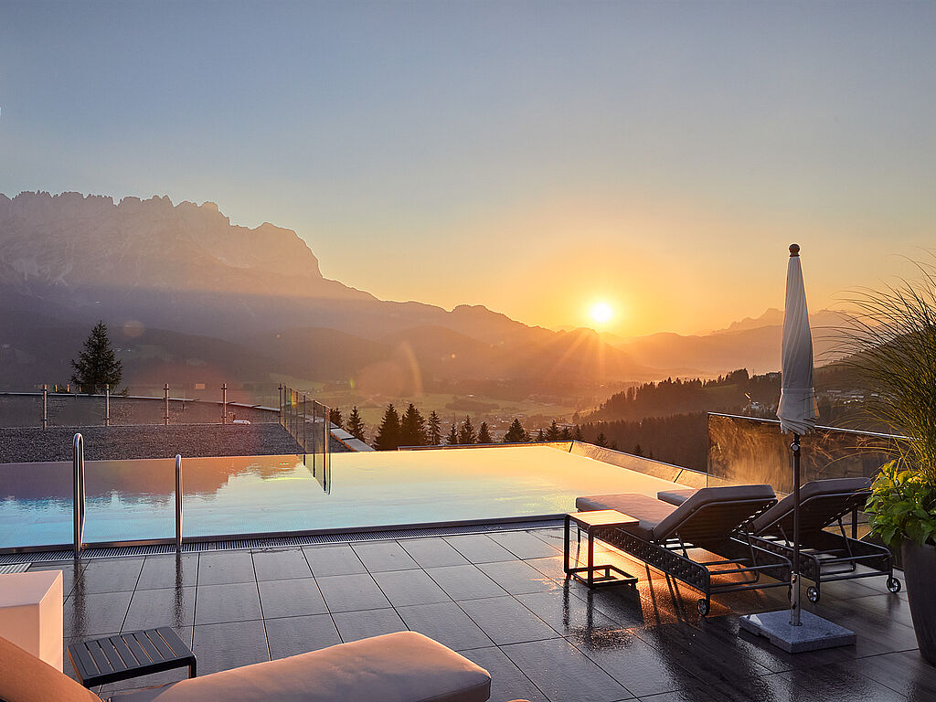 Ein absolutes Highlight ist der Unlimited Mountain Pool mit einem grenzenlosen Weitblick auf dem Dach des 4-stöckigen SPA-Turms. Hier schwimmen Sie hoch über den Baumwipfeln und lassen den Blick über die Region rund um den Wilden Kaiser schweifen. Die Aussicht erstreckt sich von den Kitzbüheler Alpen über den Wilden Kaiser bis hin zum Inntal in unendliche Ferne – ob von der Sommersonne geküsst oder von schneebedeckter Pracht umgeben.