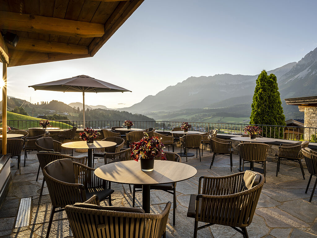 Zu den Highlights des Hotels gehört auch die ausgezeichnete Kulinarik, mit der die Gäste fast rund um die Uhr verwöhnt werden. Auf der Sonnenterrasse mit Blick auf den Wilden Kaiser genießt man am Nachmittag hausgemachte Kuchen und am Abend außergewöhnliche Cocktail-Kreationen, im stilvollen Restaurant überraschen heimische Produkte in frischer Kombination.