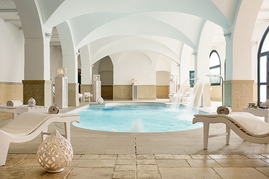 Beim Verkosten der mediterranen Küche ist man abends dann aber wieder etwas versöhnt und genießt die romantische Stimmung im illuminierten Innenhof, der auch für Konzerte und Events super geeignet ist, denn hier draußen stört man wirklich niemanden. Wer Lust auf ein Spa-Treatment hat, muss sich leider gedulden. Aufgrund der Corona-Pandemie wurde die Anzahl der Mitarbeiter reduziert, sodass nur wenige Behandlungen buchbar sind und das Spa öfters geschlossen ist. Indoor Pool, Whirlpool und Hamam sind davon jedoch ausgenommen. Der hoteleigene Strand liegt fünf Kilometer entfernt und kostet 15 Euro am Tag.