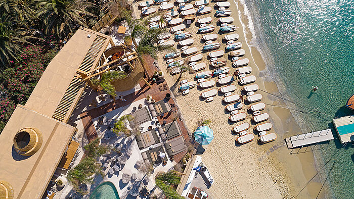 Mit dem Nammos befindet sich einer der bekanntesten Beach Clubs gleich nebenan und im neuen Nammos Village ist Luxus-Shopping angesagt. Kein Wunder also, dass sich das Kensho sehr lifestylig gibt und schon Promis wie Paris Hilton beherbergte. Und da passt es auch, dass das direkt am Strand gelegene Lounge-Restaurant den ganzen Tag mit DJ-Klängen beschallt wird. Dabei wird auch auf Kleinigkeiten geachtet. Eine Service-Lady geht mit Wassersprühflaschen zu den Gästen, die am kleinen Strandpool sehen und gesehen werden und das Tischchen für die Handtasche der Dame kommt beim Dinner sofort.