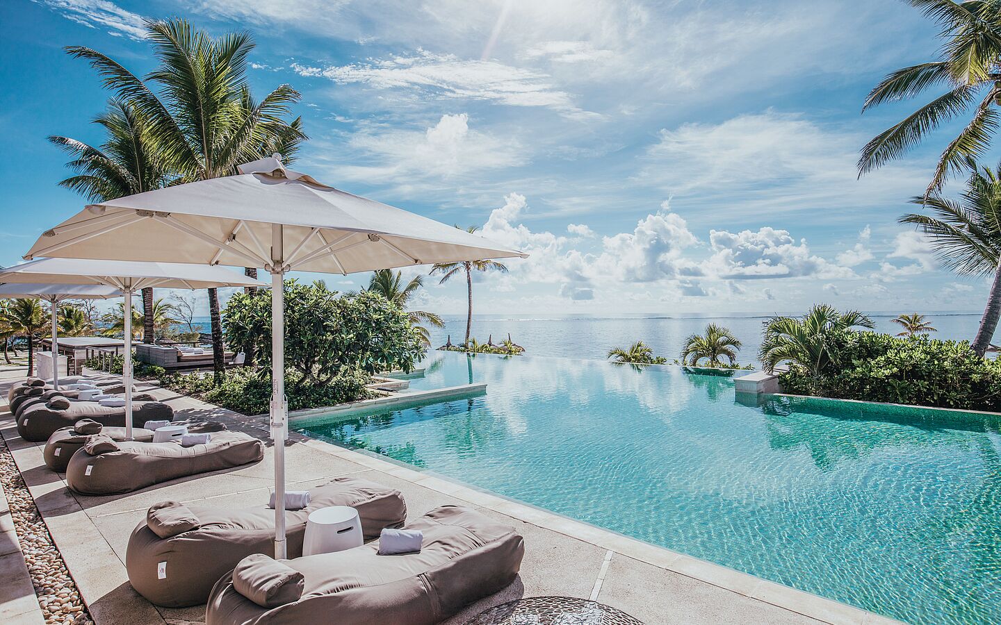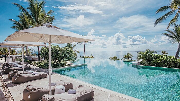 Dieses Resort macht von Beginn an Laune, hat einen guten Vibe, ist sympathisch, lebendig, aber nicht überdreht. Die vielleicht größte Überraschung: Das stimmige Herzstück ist, gut 9.000 km von Italien entfernt, eine von Restaurants gesäumte Piazza. Nach dem Abendessen strömen hier die Gäste zusammen, halten ein Schwätzchen auf den Bänken oder lauschen in der „Shores“-Bar Live-Musik. Unsere dezent elegante Premium Junior Suite mit eingeschränktem Meerblick lag ein wenig abseits, was bei der Heimkehr in der Dunkelheit tricky sein konnte: Die schwache Beleuchtung erforderte ein Handylicht, um heil die Nr. 121 zu erreichen. Der zweite Makel: Die Terrassentür war leider nur mit Gewalt aufzubekommen. In die Rattan-Relax-Muschel beim erhaben gelegenen Erwachsenen-Pool hechtet man entschieden leichter. Nur gepflegter Müßiggang wäre aber schade: Das inkludierte Aktivitäten-Programm ist vielfältig. Golfer dürfen sich an den berühmten 18 Löchern der Île aux Cerfs versuchen. Zweimal täglich ist ein Schnorchel-Trip im Angebot, daher wird die Mojito-Bar beim Wassersportzentrum vorerst links liegengelassen. Sogar einen Fußballplatz gibt es und – nein, keine Fata Morgana – eine eindrucksvolle Kletterwand! Für Bildung auf spielerische Art ist zwischendurch auch Platz. Beim Biodiversity-Trail geben Guides interessierten Gästen Einblicke in Fauna und Flora des Hotels. Wo sich nun satte Vegetation ausbreitet, stand vor 12 Jahren kaum ein Baum. Mit dem Buggy werden Kräutergarten und Bienenstöcke angesteuert. Umwelt, Kreislauf der Natur, Nachhaltigkeit: Es soll nicht nur das übliche Gesumme sein, sondern gelebte Praxis. Deshalb findet sich zum Abschied auch ein spezielles Souvenir im Zimmer: eine Sonnenbrille aus recycelten Plastikflaschen.