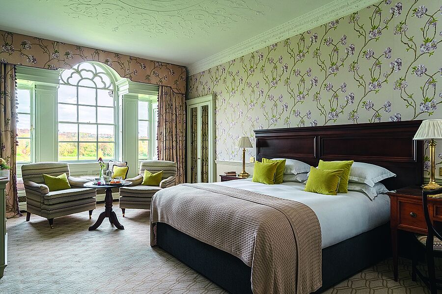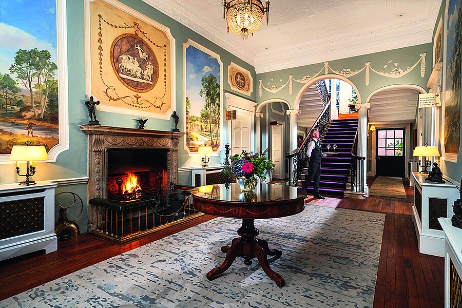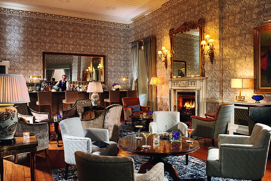 geschichte. Es wurde vom ersten Earl of Carrick auf einer Anhöhe über dem Fluss Nore erbaut und nach dessen geliebter Frau, Lady Juliana Butler, benannt. Der Ausblick von hier oben ist spektakulär. Mount Juliet bietet eine beeindruckende Auswahl an Outdoor Aktivitäten wie Reiten, Golfen, Tennis, Wandern, Falknerei, Bogenschießen, Fahrradfahren oder Fliegenfischen. Für letzteres gibt es im Manor House sogar einen extra Fishing-Room. Um die richtige Entscheidung treffen zu können, sollte man wissen, dass Mount Juliet Estate aus zwei sehr unterschiedlichen Hotels besteht: dem prächtigen Manor House aus dem 18. Jh. und dem moderneren Hunter’s Yard in den ehemaligen Stallungen. Das Frühstück mit Aussicht auf den Golfplatz wird in Büffetform angeboten. Es ist reichhaltig und vielseitig. Toast wird stilvoll im Silberständer serviert – leider verbrannt, was aber niemanden zu stören scheint. Der Service insgesamt zeigt sich sehr freundlich und bemüht. Störend beim Dinner abends im Hounds-Restaurant ist der Geräuschpegel. Das Irish Hereford Beef ist hingegen exzellent und auf den Punkt gegrillt. Die Zimmer im Hunter’s Yard sind klassisch elegant eingerichtet und bieten zeitgemäßen Komfort. Turndown-Service scheint jedoch nicht zur täglichen Routine zu gehören, und auch Wasser haben wir vermisst. Unsere Empfehlung: ein Zimmer im Manor House buchen, um den Charme und das außergewöhnliche Ambiente zu erleben. Übrigens gibt es im historischen Herrenhaus nicht nur einen kleinen, privaten Kinosaal, es wird auch ein stilvoller Afternoon Tea serviert, und täglich um 17.30 Uhr kann man Sean, den Storyteller, in der alten Bar treffen, um seinen spannenden Geschichten zu lauschen.