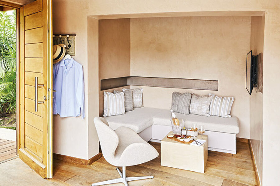 Wer weniger privat genießen möchte, macht sich auf den Weg ins zehn Fußminuten entfernte Stadtzentrum oder an die lauschige Hotelbar. Hingucker hier ist ein gläserner Fußboden, der den Blick auf einen Weinkeller mit rund 30 Champagnersorten und mehr als 200 Bordeaux-Bouteillen freigibt. Ein Roederer Cristal 2006, die 3-Liter-Jéroboamflasche zu 6.000 Euro, ist da unten ebenso zu finden wie ein Paulliac Lafite-Rothschild, Jahrgang 1990, für wohlfeile 2.900 Euro. Mit zwei Flaschen Ruinart (Rosé und Blanc de Blanc) ebenfalls imposant bestückt, präsentiert sich die Minibar in unserer Suite Supérieure. Was uns dort darüber hinaus gefällt, ist das ebenso edle wie entspannte Interior – ein Mix aus skandinavischen Designklassikern und traditionell provencalischen Elementen. Als Alternative zu unserem Refugium mit Blick auf die hoteleigenen Weinreben bieten sich die Zimmer und Suiten direkt am Pool an. Dort wohnt es sich zwar weniger intim, dafür aber fast ebenso ruhig, befindet sich das gesamte, von einer hohen Steinmauer umgebene Anwesen doch mitten in einer exotischen Gartenanlage. Ein „cosy Corner“ der ganz besonderen Art ist der lauschige L’ Espace Zen. Zum einen erweitert er das Angebot des kleinen „Le Spa by Sothy“ um Massagemöglichkeiten im Freien, zum anderen verfügt er über ein Yoga- und Meditationsdeck, das sich hydraulisch über einen XL-Whirlpool schieben lässt.