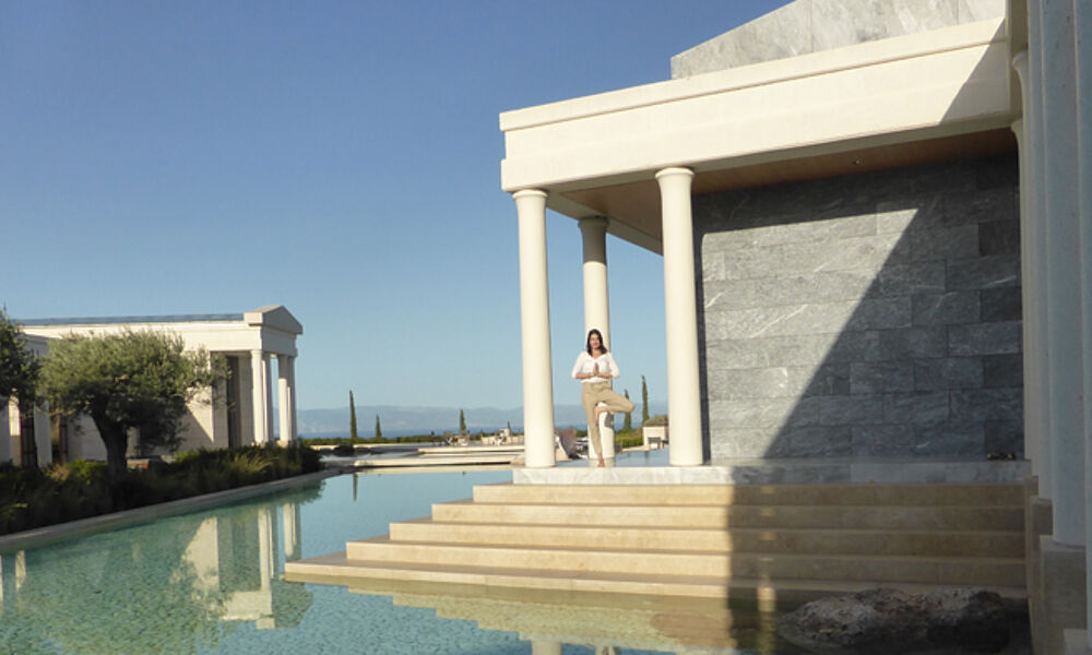 Im Restaurant des exklusiven Beach Clubs, der in einer idyllische Bucht mit türkisblauem Wasser liegt, genieße ich nach einigen Längen im 25 Meter langen Pool einen leichten Lunch mit den vielleicht aromatischten Oliven der Welt und frischem Fisch. Hippokrates wäre bestimmt begeistert von dieser köstlichen "Diät"! Und er wäre in Sachen Bewegungstherapie in reinste Verzückung geraten ob der Top-Ausstattung des Gyms, des „state of the art“-Pilates-Studios und des lichtdurchfluteten Yoga-Pavillons. Dieser bietet mit seinem herrlichen Ausblick ein ideales Setting für die morgendlichen Yogaeinheiten mit Manos. Mystische Momente erlebe ich in einer sternenklaren Nacht beim Vollmond-Yoga im Amphitheater des Resorts.