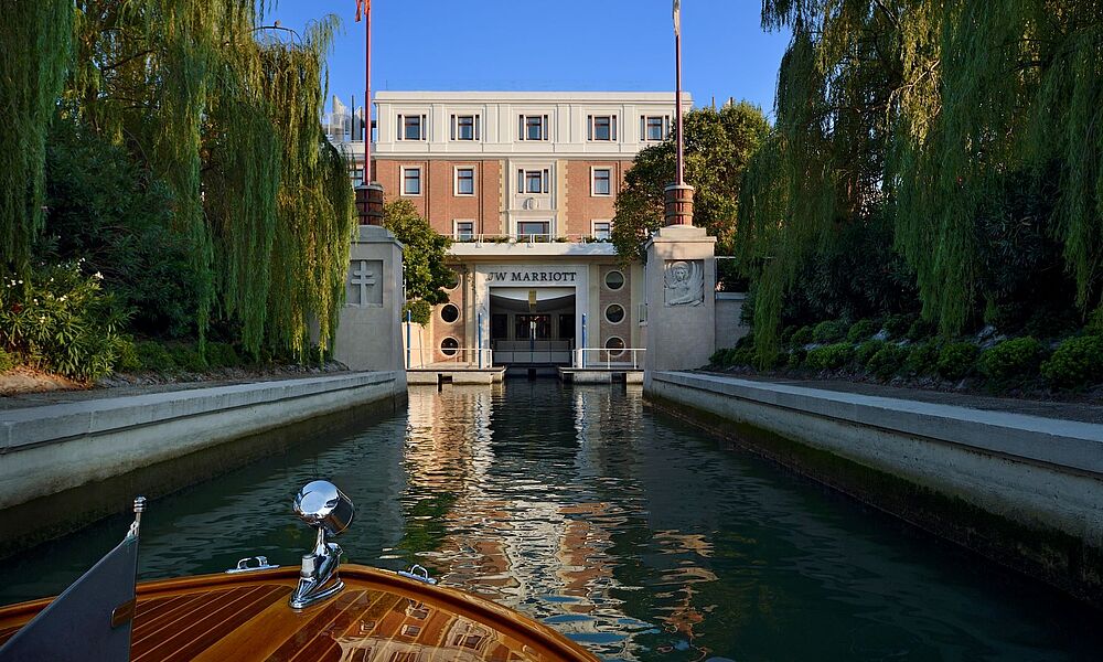 Doch tatsächlich kann La Serenissima auch ganz ruhige Töne anschlagen, nämlich die der puren Entspannung und Entschleunigung an einem Ort, den nicht einmal so mancher erfahrene Venedigliebhaber hier erwartet hätte! Mein Wellnessgeheimtipp à la veneziana liegt nur ein paar Bootsminuten vom Markusplatz entfernt auf der Privatinsel Isola delle Rose. Hier weht seit der Eröffnung des JW Marriott Venice Resort & Spa vor wenigen Jahren ein neuer Wind. Schon bei der Anfahrt zur Insel kommt wahres James Bond Feeling in mir auf als das private Shuttleboot auf den imposanten Empfang, versteckt hinter üppigen Bäumen, zusteuert. Spätestens nachdem ich mit einem charmanten „benvenuta signora“ und einer helfenden Hand dem Boot entsteige wähne ich mich in einer anderen Welt, ganz weit weg vom Trubel Venedigs und doch nah genug um mich diesem hinzugeben wann immer es mir danach gelüstet!
