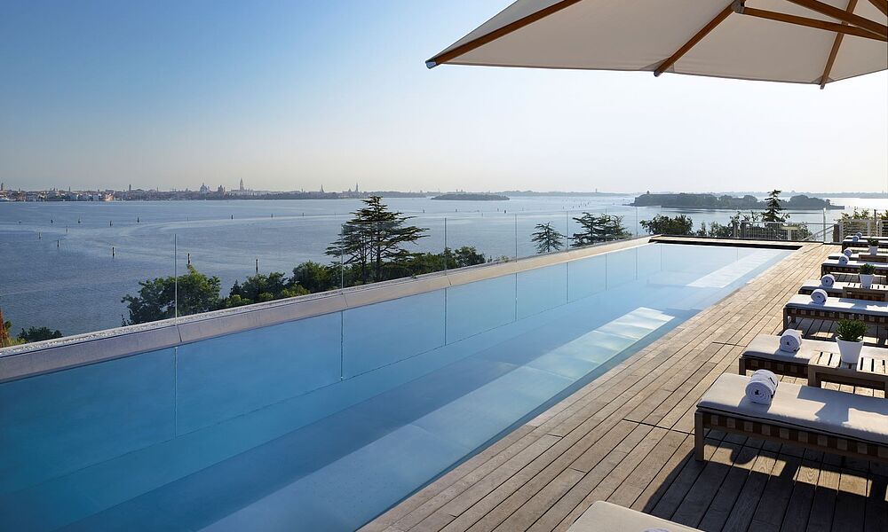 Mediterrane Insel-Vibes liegen auch auf der Dachterrasse des Hotels in der Luft: lässig und entspannt dank einer stimmigen DJ-Playlist und Cocktailkarte geht es in der Rooftop Bar und am „very instagramable“ 360-Grad Infinity-Pool zu - inklusive einem einfach atemberaubenden Ausblick auf die Skyline von Venedig und San Marco. Der Pool ist auch im Frühling und Spätherbst wohlig warm und macht das „Blicke über Venedig schweifen lassen“ zu einer fast meditativen Erfahrung. Richtig magisch wird die Stimmung wenn die untergehende Sonne die Lagune in ein Farbenmeer von zartrosa bis feurig rot verwandelt.