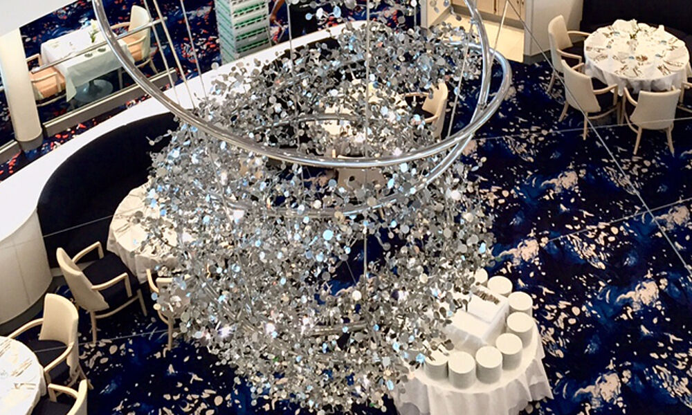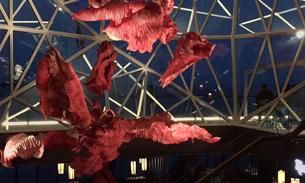 Und dann gibt es auf Deck 4 auch noch das „Hanami by Tim Raue“. Im Schatten eines riesigen, korallenroten Origami-Baums und mit Blick auf die Heckwelle genießt man hier feines Sushi und die Signature-Dishes des Berliner Zwei-Sterne-Kochs wie etwa den gedämpften Zander mit Lauch und Ingwer, die Ente mit Tamarinde und Fives Spices oder den Yuzu-Cheesecake mit Baiser und Karamell.