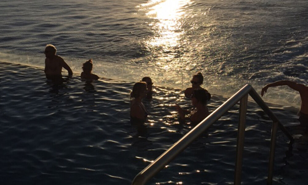 Scheint so, als wollten die da oben auf der Brücke, dass wir auf keinen Fall den kitschig-rosa Sonnenaufgang über dem türkisblauen Meer und den strahlend-weißen Häusern von Mykonos-Stadt verpassen. Danke für den frühen Weckruf – der Anblick war es wert! Nach einem ausgiebigen Frühstück an Deck steht heute ein Tag am Strand auf dem Programm: Boot, Bus, Beach-Club und wieder zurück – alles perfekt vom Ausflugsteam an Bord durchorganisiert – und alles kostenlos. Bis auf den Cappuccino aus dem Pappbecher natürlich, den wir uns an die Sonneliege servieren lassen und der selbst in der Nachsaison noch immer mit stolzen 5,50 Euro zu Buche schlägt. Und wo wir gerade bei stolzen Preisen sind: 180 US-Dollar für die 50-minütige Massage später im Schiffsspa sind zwar auch kein Schnäppchen, dafür aber eine Wohltat ...