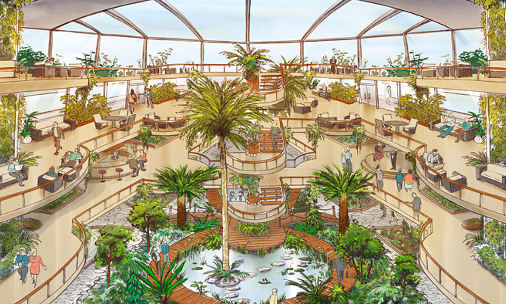 Und das ist auch gut so: Denn schließlich hinterlässt ihr Ecoship so gut wie keine Schadstoffe mehr. Dafür sorgen die silbrig glänzenden Solarsegel, die den revolutionären Luxusliner mit selbstproduziertem Strom versorgen, sowie emissionsarme Antriebssysteme und eine Aufbereitungsanlage, die Abwässer fast zu 100% recycelt. Dass dabei auch der Komfort an Bord nicht zu kurz kommt, beweisen die ersten Pläne der visionären Schiffsplaner: offene Decks mit Gärten und Teichen, große Fensterfronten, jede Menge Balkonkabinen ... Wann wir mit dem ersten Ecoship aufkreuzen können, steht leider noch in den Sternen. Wer will, kann sich auf der Website aber jederzeit mit guten Ideen und Anregungen einbringen und so den Traum vom Clean Cruising vielleicht ein bisschen schneller wahr werden lassen...