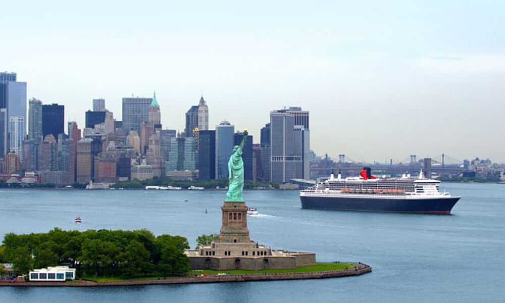 Auch wenn die Queen Mary 2 – und all die anderen Cruiseliner – längst nicht mehr am Hudson River, zehn Fußminuten vom Times Square entfernt, anlegen dürfen, hat sich an der Faszination nach New York einzulaufen nichts geändert. Vor allem dann nicht, wenn man auf der klassischen Transatlantikroute anreist und fünf Tage lang kein Land gesehen hat. Zuerst geht es zentimetergenau unter der Verranzano-Narrows-Bridge durch, dann vorbei an der Freiheitsstatue und schließlich, die Skyline von Downtown Manhattan im Blick, rechts weg zum Anleger. Patriotische Amerikaner an Bord stimmen in diesem Moment gerne lautstark ihre Nationalhymne an. Ich lausch‘ lieber Alica Keys über AirPods: „These streets will make you feel brand new, big lights will inspire you – now you’re in New York, New York …”
