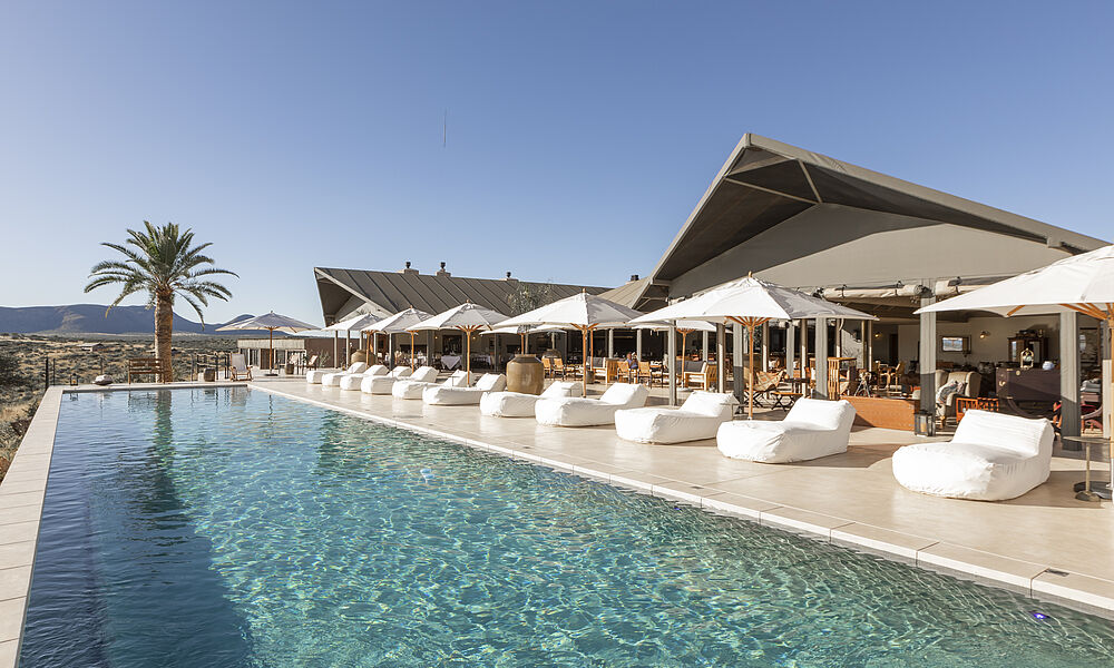 Es ist eines der wörtlichen Versprechen in Namibias neuester Luxus-Lodge: „die Kunst, das Leben zu genießen“. Ermöglicht wird das durch die österreichischen Familie Friesacher, die seit zwei Jahren hier das Nonplusultra für anspruchsvolle Reisende bietet. Dazu zählt allein schon die exponierte Lage eingebettet in eine atemberaubend schöne Landschaft zwischen der Kalahari-Wüste im Osten und dem Khomas-Gebirgsplateau im Westen. Was sicherlich auch zur Mitgliedschaft bei den Relais & Chateau Hotels beigetragen hat, denn das Anwesen mit 12 ganz unterschiedlichen, eleganten Villen ist gekonnt mit tollen Ausblicken in diese grüne Landschaft drapiert.