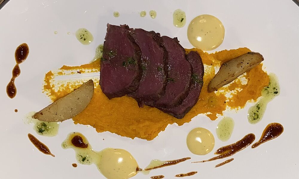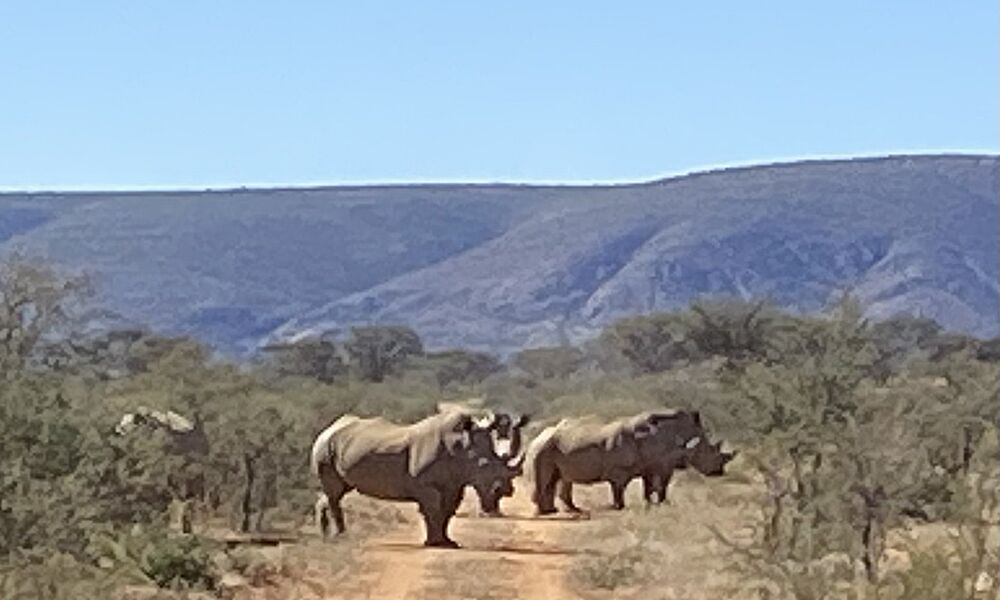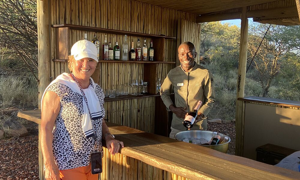 Ein Rundum- Sorglos- Programm ist ein weiteres Phänomen dieser Lodge: Ob Pirschfahrten auf dem 6000 Hektar großen Areal mit Wildpark und Landebahn für den hauseigenen Helikopter, Tennis, das Spa, Motorrad- und Quadfahrten sowie Golf – alles ist hier inklusive. Morgens nach dem Frühstück werden die Wünsche besprochen und anschließend gleich arrangiert. So einfach geht Urlaub! Wir entschieden uns für eine Runde Golf auf dem 30 KM entfernten Omaya Golf Club und eine Pirschfahrt am nächsten Morgen. Gleich zu Beginn grüßte uns dort gleich eine Giraffen-Familie, die sich von den Autos nicht stören ließ, ebenso die Kudus, Springböcke, Gnus und Zebras. Nur der Rhino hielt sich in angemessenen Abstand zu uns, was auch gut war. Jede Pirschfahrt endet hier mit einer Sundowner Zeremonie am eigenen Aussichtsberg mit fantastischem Blick über die sanft bergige Gegend. Wenn sich dann der Himmel glutrot färbt und man in einen der bequemen Stühle versinkt, genießt man nicht nur den schon legendären Gin Tonic sondern hier eben auch Champagner Rosé aus schönen Gläsern. Dass sich dabei auch interessante Gespräche mit anderen Gästen sowie dem Personal ergeben, ist nicht nur der besonderen Stimmung geschuldet. Man merkt, wie gut die „San“ hier aufgehoben sind, wie glücklich sie mit ihrer Arbeit sind und das ergibt natürlich auch einen Super-Service.