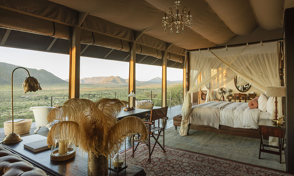 Ein wenig erinnert das Innere an längst vergangene Safari-Zeiten mit Vintage-Mobiliar in Leder und Mahagoni, Himmelbetten und sorgsam inszenierte antike Safari-Raritäten, wie Teleskope und Ferngläser. Alles großzügig geplant mit Wohn-und Schlafraum auf über 200qm, Terrassen und einem überdimensionalen Badezimmer. Besonders abends genießt man den Blick von der ausladenden Terrasse in einen unvorstellbar tiefen Onyxhimmel, der übersät ist mit Sternen. Dann ist Zeit für Romantiker, denn die Lodge leuchtet im warmen Schein der flackernden Laternen und Kerzen und die Badewanne auf der Terrasse sorgt für behagliche Wärme. Das Haupthaus, wo das Restaurant, eine gut gefüllte Bar, Bibliothek und Wohnraum untergebracht sind, erreicht man fußläufig in ein paar Minuten.