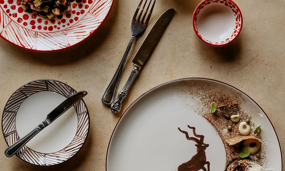 In Kooperation mit der Gmundner Keramik in Österreich und der Acadamy of Ceramics hier entstand ein spannender Austausch: Mitten in der Kalahari kreierten KünstlerInnen der San Entwürfe auf Papier, Tellern und Figuren, die dann von MalerInnen der Gmundner Keramik Manufaktur in Österreich gebrannt wurden. Hand bemalt ist jedes einzelne Stück eine Hommage an die atemberaubende Natur Namibias. Übrigens kann jeder Gast hier seine persönliche Kreation an Tassen, Tellern und Bechern herstellen, die anschließend gebrannt und nachhause mitgenommen werden können. Diese „Malstube“ am Farmgelände ist mit komplettem Equipment ausgestattet, sodass man seiner Phantasie freien Lauf lassen kann.