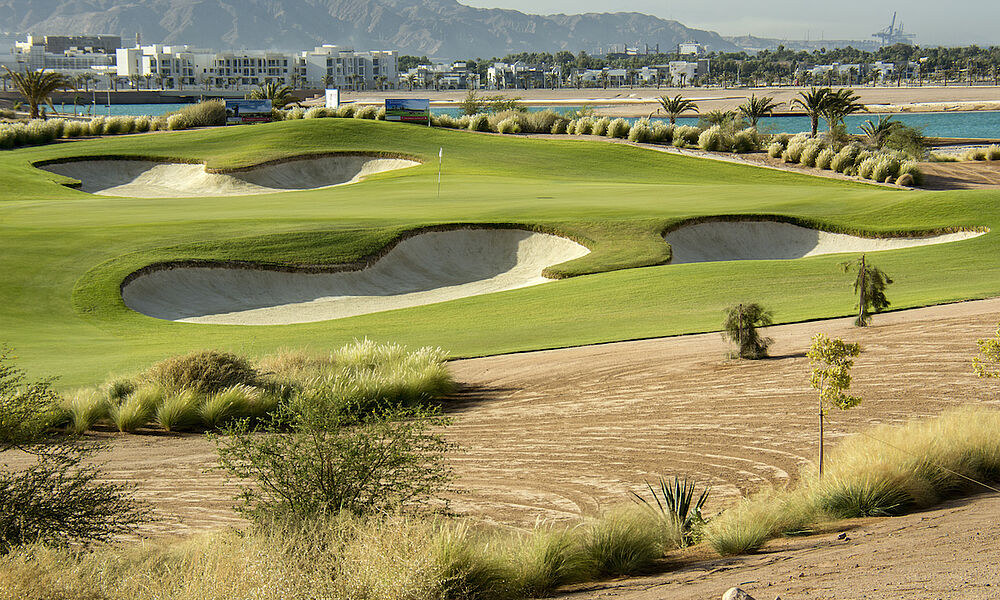 Jordanien war zum Unterschied zu Südafrika eine völlig neue Golfdestination für mich. Zugegeben, in erster Linie lockten mich die UNESCO-Welterbestätten, wie Petra und die Wüste Wadi Rum nebst Aqaba, genannt das goldene Dreieck. Die wirkliche Überraschung gab es aber in Ayla, dem nagelneuen Zukunftsprojekt Jordaniens auf 4.300 Quadratkilometern. Schon eröffnet sind zwei Beach Clubs, die Island und die Golf Apartments sowie das 5-Sterne-Hotel Hyatt Regency Aqaba Ayla Resort mit Spa, vier Restaurants, mehreren Pools und der Ayla Golf Club. Designt von Golf-Ikone Greg Norman gilt er weltweit als einer der umweltfreundlichsten und für mich einer der schönsten im Orient. Mit Blick auf die Berge, das Rote Meer und das nahe Israel ziehen sich die 18 Bahnen wie grüne Bänder durch die Wüstenlandschaft. Ein Layout, das durch Bäche, Seen und Buschwerk einen besonderen Reiz ausübt. Eben unvergesslich!