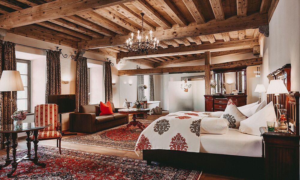 Aus dem Dornröschenschlaf wach geküsst hat es nun schon seit sieben Jahren der als Schlossherr fungierende Mittersiller Notar Johann Bründl, dem es gelungen ist aus dem “alten Kasten“ ein richtiges Juwel in der Hotelszenerie rund um Kitzbühel zu etablieren. Hilfestellung geben dafür noch heute so illustre Namen, wie Jacky Kennedy, Coco Chanel, Jacky Onassis oder Henry Ford, die allesamt dem „Sport- und Shooting-Club“ des damaligen Besitzers Baron Hobert von Pantz angehörten, in deren prächtigen Suiten man heute noch im traditionellen Ambiente logieren kann. Dabei sticht die Hochzeits-Suite mit bemalter venezianischer Holzdecke, offenem Kamin und historischem Mobiliar, in der Königin Juliane von den Niederlanden und ihr Prinz Bernhard 1937 über 6 Wochen lang ihre Flitterwochen feierten ganz besonders hervor. Aber wie es für ein Boutique Hotel gehört, ist jedes der 55 Zimmer und Suiten andersartig gestaltet und das Ambiente ein gekonnter Mix aus Tradition und „modern Style“.