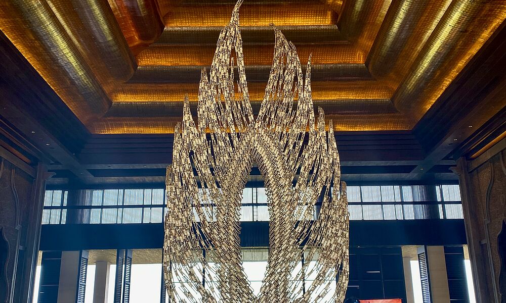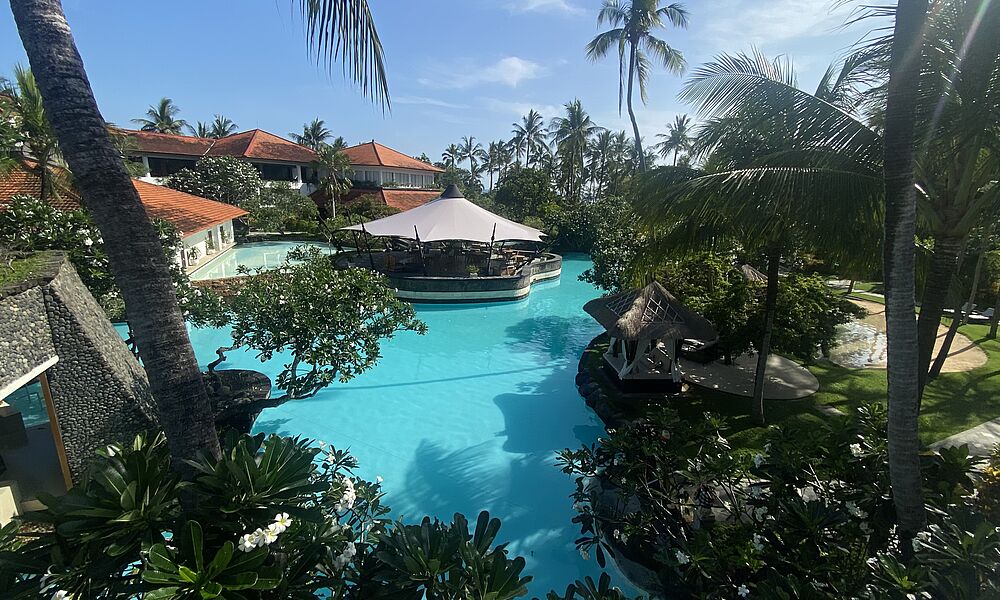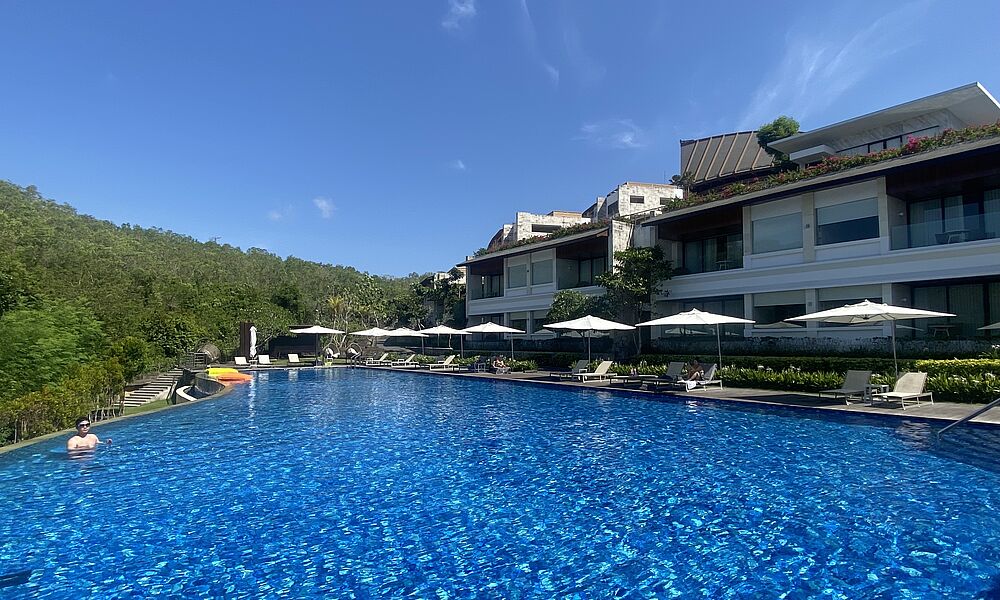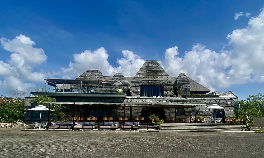 Einer der jüngsten von den vier Golfplätzen hier ist der Bukit Pandawa Golf & Country Club, der sich in erhöhter Lage auf den Kalksteinklippen in der Nähe der Bukit-Halbinsel mit herrlichem Blick auf den Ozean befindet. 18 mal Par 3 Löcher zu spielen erscheint auf den ersten Blick ziemlich easy – ist es aber nicht! Fast an allen Löchern gibt es Hindernisse in Form von Mauern, Klippen, Bunkern oder tiefe Schluchten. Aber auch traumhafte Aussichten über Flamboyant Bäume zum Meer. Das Clubhaus könnte locker einen Design-Award bekommen: Außen in Form eines Tempels, innen mit stylisch modern mit viel Wasser und grauem Stein. Unser Umzug ins Renaissance Hotel nach Uluwatu bescherte uns ein neues AHA-Erlebnis: Hoch auf einem Hügel gelegen mit offenem Blick auf die Dschungel-Landschaft rundherum und das Meer, beherbergt das Hotel ein junges, hippes Publikum, das an der großen Poolanlage bei chilligem Sound relaxt.