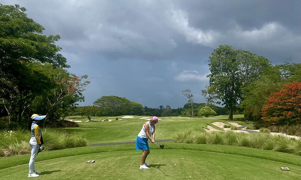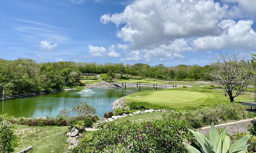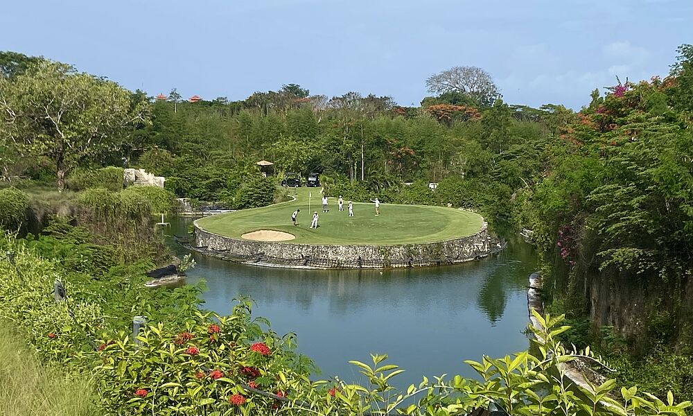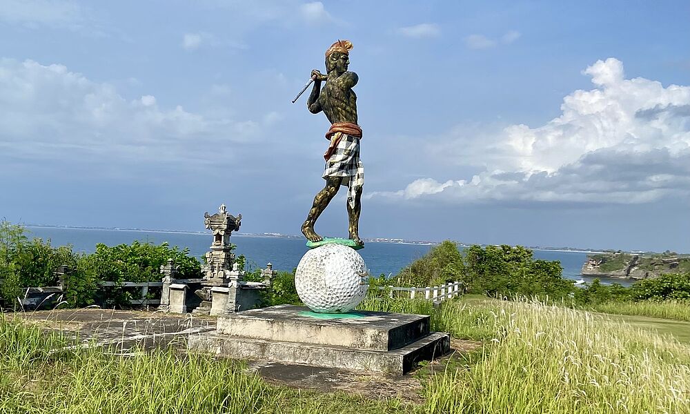 Von hier ist es nicht weit zum New Kuta Golf Course, der auch zu den neueren hier zählt. Zu den denkwürdigeren Löchern gehört das 6. Loch, das nach dem Golfplatzdesigner Ronald Fream liebevoll "Fream's Island" genannt wird. Das Inselgrün besteht nicht aus Wasser, sondern aus einer riesigen Sandfläche. Uns hat die Aussicht vom 14. Abschlag aufs Meer fasziniert und auch auf der 15 gibt es einen unglaublichen 360-Grad-Blick über das Meer und die Strände. Ein wenig bedauerlich sind allerdings die Bauruinen rundherum, die eigentlich Luxushotels hätten werden sollen.
