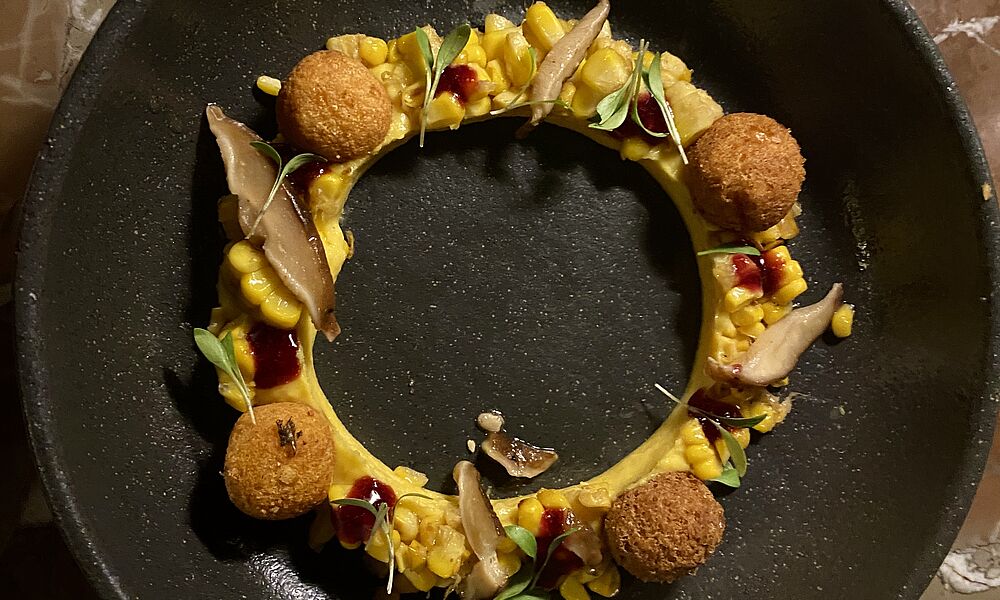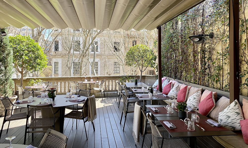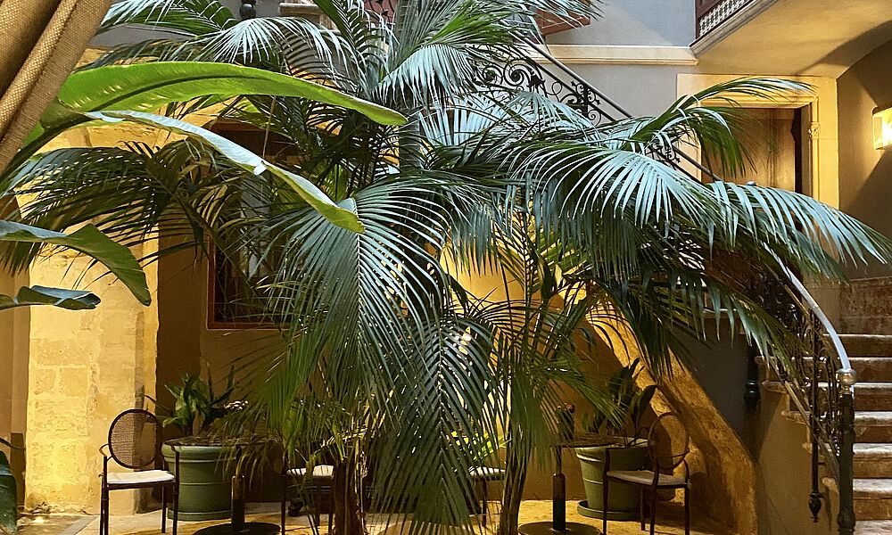 Übernachtung im Hotel Sant Jaume weil es mitten in der Altstadt zwischen einer imposanten gotischen Kirche und einem Barockkloster aus dem 14. Jahrhundert liegt. Von außen wie ein ehemaliges Patrizier-Wohnhaus aus dem 18.Jahrhundert, bietet die Lobby dann den AHA-Effekt mit kunstvoll arrangierten Bildern und stylischer Bar. Die eher puristisch wirkende Einrichtung im Restaurant wird durch Kunstgegenstände etwas aufgelockert und soll das Augenmerk auf die köstlichen Speisen richten. Minimalistisch, im Contemporary Stil eingerichtet wirken die Zimmer mit eleganten Holzböden trotzdem gemütlich und das Rooftop mit Terrasse und Pool lässt jedes Herz höherschlagen. Das Hotel gehört mit drei weiteren Häusern zur Gruppe der „IT Mallorca Unique Spaces“ – alle im 5-Sterne Luxusbereich und alle mit einem bestimmten Konzept. Gleich in der Nähe befindet sich das Can Alomar, das Calatrava und das Can Cera, das sich hinter einem riesigen Tor versteckt und nur angemeldeten Gästen Einlass gewehrt. Sehr empfehlenswert fanden wir das Essen im romantischen Garten des Restaurant Botànic-Can Bordoy mit Food Sharing und besten Weinen von der Insel.