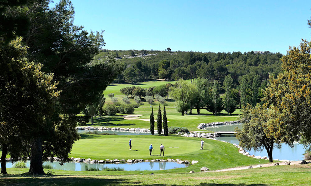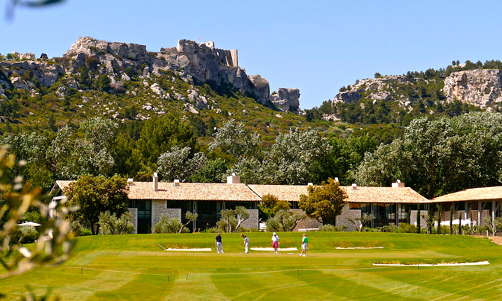 Das heißt: Zwischen schroffen Kalksteinfelsen und hügeligen Olivenhainen. In diesem Fall kommt noch etwas Besonderes hinzu, denn der ökologisch zertifizierte 18-Loch-Golfplatz (Par 36, 2835m)der Domaine de Manville fügt sich sanft in die Umgebung ein. Die nahegelegenen landwirtschaftlichen Felder dienten als Vorbild für die quadratischen Greens und Fairways, Olivenbäume und Bachläufe sind nicht nur natürliche Hindernisse, sondern dienen als Lebensräume geschützter Tierarten wie der Perleidechse und von den teils erhöhten Abschlagplätzen hat man auch noch traumhafte Ausblicke auf das mittelalterliche Dorf Les Baux-de-Provence. Alles in allem kein spektakulärer aber ein schöner Urlaubsplatz. Denn das gleichnamige 5-Sterne Resort, ein ehemaliger Gutshof mit 9 Villen und 30 luxeriösen Zimmern und Suiten, einem Sterne-Restaurant und Bistro sowie einem SPA mit Pool, Saunen und Fitnessbereich gehört zum golfplatz dazu und wirbt mit verschiedenen Packages ( www.domainedemanville.f) .
