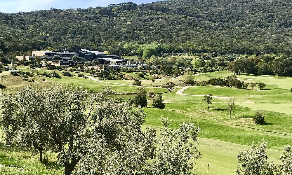 Uns interessiert hier vor allem der gleichnamige 18-Loch Golfplatz, dessen Layout vom Amerikaner Brain Jorgensen konzipiert wurde. Das Resultat ist überraschend abwechslungsreich zwischen Olivenbäumen technisch anspruchsvoll und zweifellos von der Aussicht her spektakulär. Fast alle Grüns sind relativ klein und teilweise onduliert, was das Putten schon zum Erlebnis macht. Schön, dass hier fast immer eine Brise weht, das hilft auch bei grösster Sommerhitze. Beeindruckt hat uns auch das Layout, das zwischen Kork- und hundertjährigen Olivenbäumen hindurchführt. In dieser noch fast unberührten Natur kann man noch auf Kaninchen, Eichhörnchen und Hirsche treffen und geniesst zudem ein atemberaubendes Panorama. Zudem offeriert das Resort noch Tennis, Fussball, Fitness und diverse Pools - perfekt für Ferien mit der ganzen Familie.
