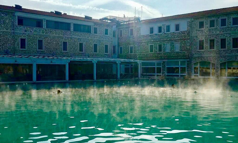 Mit unseren 230 Pferdestärken sind wir dann relativ schnell im Herzen der toskanischen Maremma gelandet, einer sanft hügeligen Landschaft, die im milden Nachmittagslicht golden leuchtet. Schon die lange Auffahrt zum Resort zwischen blühenden Büschen am Rande des dazu gehörenden Golfplatzes verspricht diskreten Luxus, gemischt mit heimeliger Atmosphäre. Diese setzt sich fort in den typisch toskanischen Steingebäuden des zu den „Leading Hotel of the World“ gehörenden Hotel mit 140 Zimmern und Suiten, gestylt nach einem „Habitat“ mit Parkett, Marmor und Travertin. Stylisch modern hingegen ist das Ambiente in den Restaurants Aqualuce und All’Acquacotta, das gerade mit dem 1. Michelin Stern dekoriert wurde und natürlich im Spa, einem achteckigen Gebäude, das man schon an den Wohlgerüchen erschnuppern kann. Ein tolles Angebot vom ausgereiften Anti-Aging-Programm bis zu innovativen Schönheitstherapien wartet hier auf die Gäste und wer es geniesst bestätigt gerne, dass es zu den meistprämierten des Landes gehört. Trotzdem geht es hier angenehm „ casual“ zu, denn das Herzstück des Resorts ist die Therme, deren 37 Grad heisses Heilwasser hier schon seit 3000 Jahren sprudelt und die Pools speist. Die nachgewiesen positive Wirkungen auf das Herz-Kreislauf- und Atmungssystem, die Muskulatur, das Knochengerüst und die Atemwege lockt hier ganzjährig Gäste aus aller Welt, die sich auch nicht an dem etwas strengen Schwefelgeruch stören. Wir haben besonders das Bad in der Morgendämmerung genossen, wenn sich die Morgenröte im aufsteigenden Seedunst spiegelt und gleichzeitig eine wunderbare Entspannung vor der Golfrunde sein kann. Denn der gleichnamige 18-Loch-Platz schmiegt sich in leicht welligen bis hügeligem Terrain direkt an das Resort. Auf den 1. Blick ein schöner Urlaubsplatz, hat er doch auch einige Tücken: unter anderem wird das Gelände von drei Bächen durchzogen, zusätzlich fordern großflächige Wasserhindernisse den Golfer auf immerhin fünf Löchern. Damit bietet er auch dem Team der PGA of Germany einen idealen Winter-Trainingsstützpunkt. Und noch etwas hat uns gut gefallen: Es gibt hier keine Startzeiten, was das Urlaubsfeeling noch verstärkt und wer zusätzlich noch Lust auf Training hat kann das in aller Ruhe auf dem angrenzenden Übungsplatz erledigen. Auf der Fahrt Richtung Süden passieren wir einige etruskische Städtchen, die sich hoch oben auf Tuffspornfelsen zusammen kuscheln und sicherlich einen Stopp wert sind – wie Pitigliano, wo wir uns ein Gläschen Morellino gönnen und dazu den herrlichen Blick ins Tal.