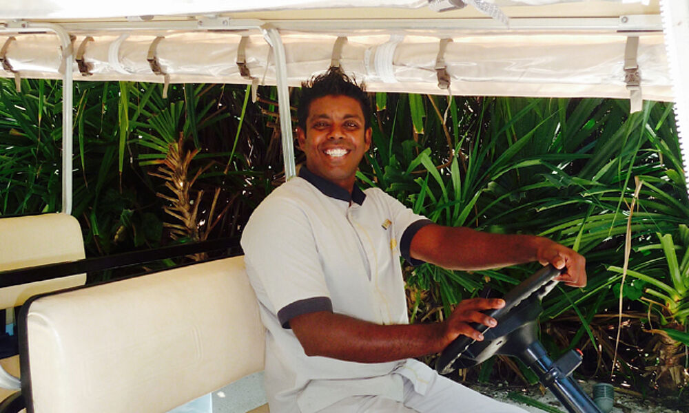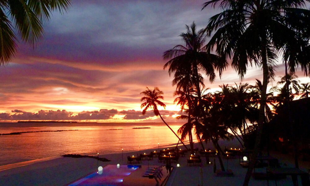 Buddy ist mein Butler und wie kann ich ihn beschäftigen, ist die Frage. So fährt er mich mit dem Golf Cart morgens zum Arthiri Restaurant, mittags zum Teppanyaki Live-Cooking in den stylischen Tavaru-Tower, der nicht größer sein durfte wie die höchste Palme und dazu noch einen gut bestückten Weinkeller beherbergt und abends dann zum Fine-Dining ins Sterne-Restaurant Aragu mit Cru Champagne Lounge. Ich verliebe mich sofort in die Currys, die Fischgerichte und in die exotischen Früchte, die mir Buddy auch ins Zimmer serviert – neben der Flasche Champagner. Ein bisschen „wie Gott in Frankreich“, kommt es mir vor.