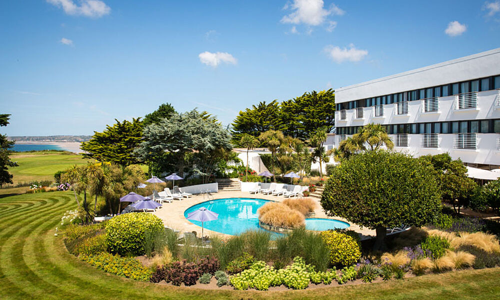 Das „Atlantic Hotel“ ist eines der wenigen 5-Sterne Häuser auf der Insel, zählt zu den Small Luxery Hotels und bietet als einziges Hotel einen atemberaubenden Blick auf die St. Ouen's Bay und den kristallklaren Atlantik. Und obwohl es schon 50 Jahre auf dem Buckel hat, ist es keineswegs verstaubt. Das liegt am charmanten Hotelier-Ehepaar Patrick und Treena Burke, die ihr Schmuckstück mit viel Liebe zum Detail eingerichtet haben. Mir gefällt der angenehme Mix aus Tradition und Moderne, den auch die 50 Zimmer wiedergeben: Edles Kirschholz trifft hier auf mediterran-weißes Dekor. Dazu Kunst an den Wänden und eine plätschernde Quelle mit kleinem Teich, die Naturverbundenheit signalisiert. Egal ob zum Afternoon-Tea oder zum Fine-Dining im Sterne-Restaurant oder einfach nur auf einen Drink an der Bar – die Atmosphäre ist locker entspannt und keinesfalls „sophisdicated“. Ich genieße den Sunset am Pool inmitten blühender Pflanzen, den Blick auf die St. Quen´s Bay und den Jersey National Park. Außerdem grenzt der 6 ha große Garten direkt an den „La Moye Championship Golf Course“ und überblickt den Jersey National Park, wo sich der zweite Golfplatz „Les Mielles Golf and Country Club“ befindet. Der Dritte im Bunde „Les Ormes Golf Club“ liegt auch nur einen Katzensprung entfernt, während der Royal Jersey Golf Club im Osten der Insel als feiner Links Course wartet.