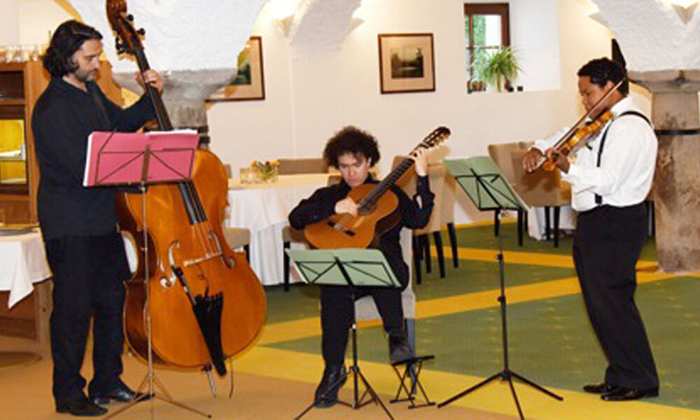 Präsident Schinwald und seine Greenkeeper tun auch alles dafür, dass es so bleibt. Ach ja – und zur Gutshof-Romantik gesellt sich eine ausgesprochen gute Küche, ein gut sortierter Proshop und ein abwechslungsreiches Turnier- und Musik-Programm. An diesem Abend gibt es das Galadinner mit Kammermusik mit dem Trio Negro als musikalische Untermalung - ein Augen- und Ohrenschmaus für die Gäste.