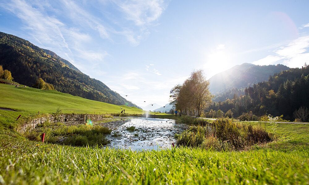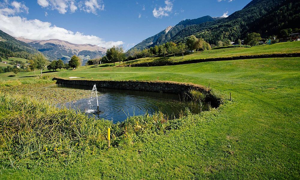Immerhin wohnt man in den beiden Andreus Resorts fast am 1. Tee, kann zur Platzreife die Akademie buchen und zu vergünstigten Preisen hier spielen. Für mich ist der GC Passeier-Meran einer der markantesten Plätze Südtirols und kein anderer polarisiert so wie er. Das liegt an den 18 teils unübersichtlichen Bahnen, die sich terrassenförmig bergauf ziehen, über Hügel und an Bächen vorbei laufen und die Grüns hinter allerlei Gebüsch verstecken. Longhitter können ihr Holz getrost stecken lassen und tun gut auf Strategie statt auf Länge zu achten. Eines der prägnantesten Löchern ist hier die 9 - das „Fuchsloch“. Ein Par 3 mit Abschlag steil bergab aufs Grün und mit einem „Birdie“ als Glücks-Score.. Auf jeden Fall ist dabei ein Card hilfreich – für das bergauf-und ab, die Ballsuche und auch fürs Verweilen bei besonders schönen Aussichten.