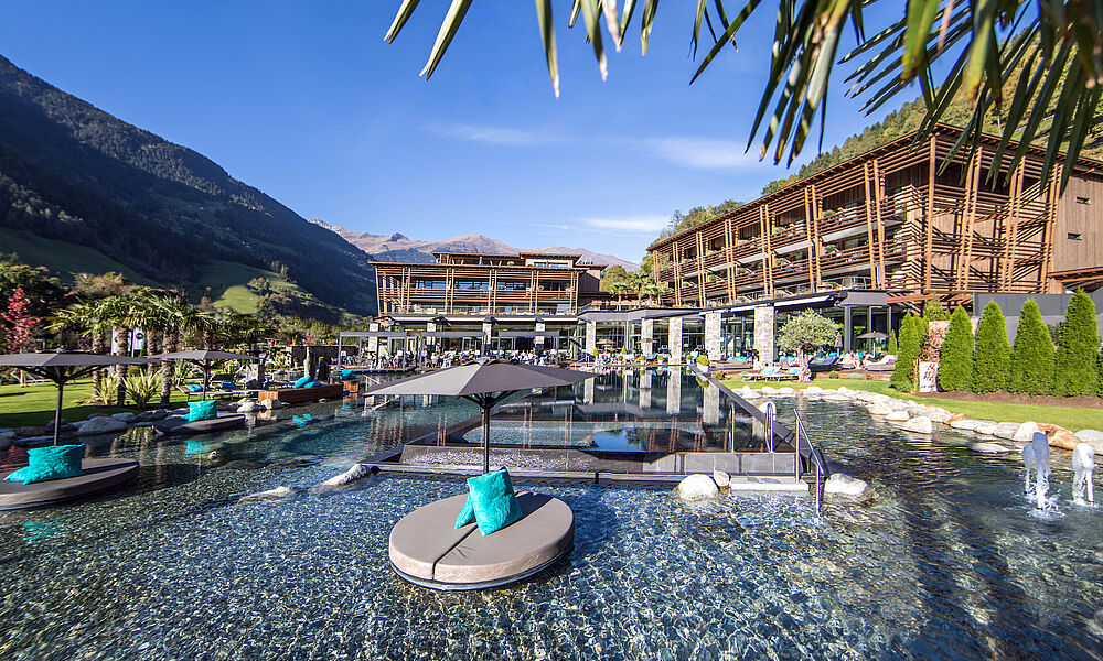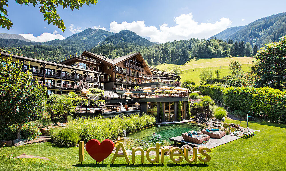 Die Reise ins 1. Mai-Wochenende nach Südtirol gestaltete sich trotz vorheriger schwieriger Einreisebestimmungen mit Quarantäne-Vorschriften erstaunlich relaxt: ein Passierschein durch Österreich genügte und wir waren ohne italienischer Grenzkontrolle! in Südtirol. Ob man dann von Sterzing aus die Pass-Strasse über den Jaufen Richtung Meran nimmt, bleibt jedem selbst überlassen. Uns führte sie durch Meter hohen Schnee auf immerhin 2000 Meter. Wie schön, dann im Passeiertal mitten im Frühling mit blühenden Obstbäumen und satt grünen Wiesen zu landen. St. Leonhard im Passeiertal war unser Ziel und wenn man sich hier in Richtung gleichnamigen Golfplatz orientiert, stößt man unweigerlich auf die Andreus Golf Lodge, deren Außenfront mit Holzverstrebungen sich harmonisch an die bäuerliche Gegend anpasst. Klein, fein und luxeriös - so präsentiert sich dieses „Adults only“ Hotel schon auf den 1. Blick mit Infinity Pool und Naturbadesee im Außenbereich, umgeben von einer romantischen Gartenanlage mit kleinen lauschigen Ecken, Daybeds und teils heimischen, teils exotischen Pflanzen. Gekonnt inszeniert besonders abends mit stylischer Beleuchtung.