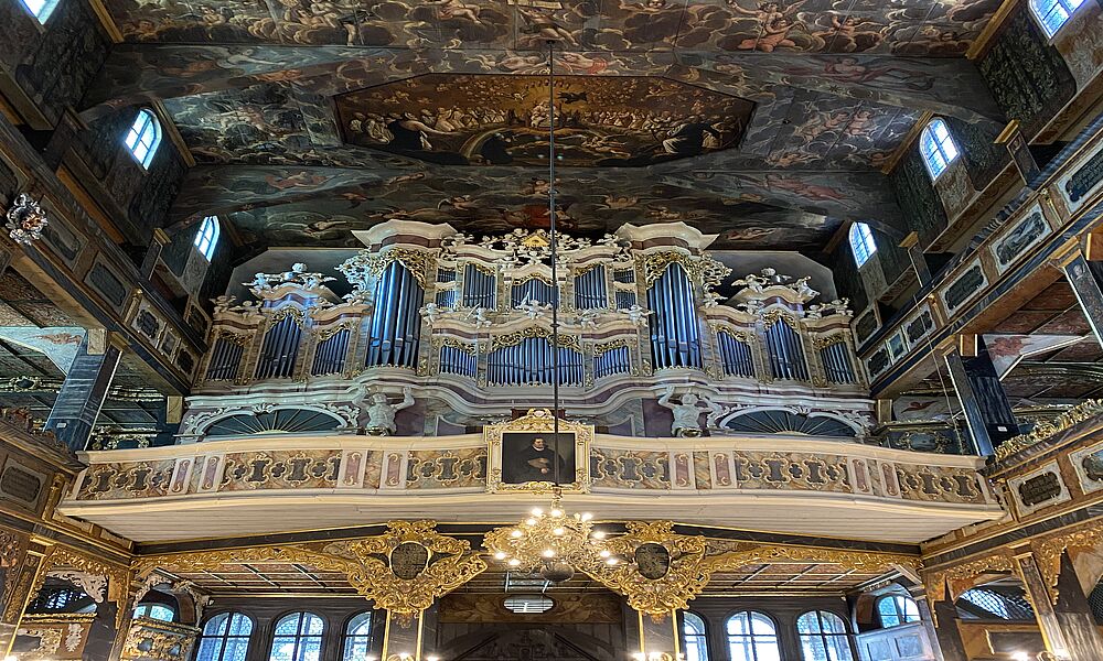 Die über 360 Jahre alte Schweidnitzer Friedenskirche «Zur Heiligen Dreifaltigkeit» entstand nach dem Dreissigjährigen Krieg, die von schlachten geprägt war. Und doch strahlen die barocken Fachwerk-Kathedralen, die von außen an riesige Scheunen erinnern eine unerschütterliche Heiterkeit und Zuversicht aus. Das Innere blendet anfangs, vor lauter Gold, den vielen biblischen Szenen und Sinnsprüche an den umlaufenden Emporen und erst recht die Decke mit Motiven aus der Offenbarung des Johannes. Man möchte hier eigentlich länger verweilen, um den ganzen Prunk näher betrachten zu können. Man erfährt auch, dass die letzte umfassende Renovierung noch zur deutschen Kaiserzeit im Jahre 1902 erfolgte und in den 1990ern eine grosse Restaurierung angesetzt, aber dann für zehn Jahre unterbrochen wurde. Seit 2013 wird mit Mitteln aus dem Europäischen Wirtschaftsraum und dem norwegischen Fonds weiter restauriert.