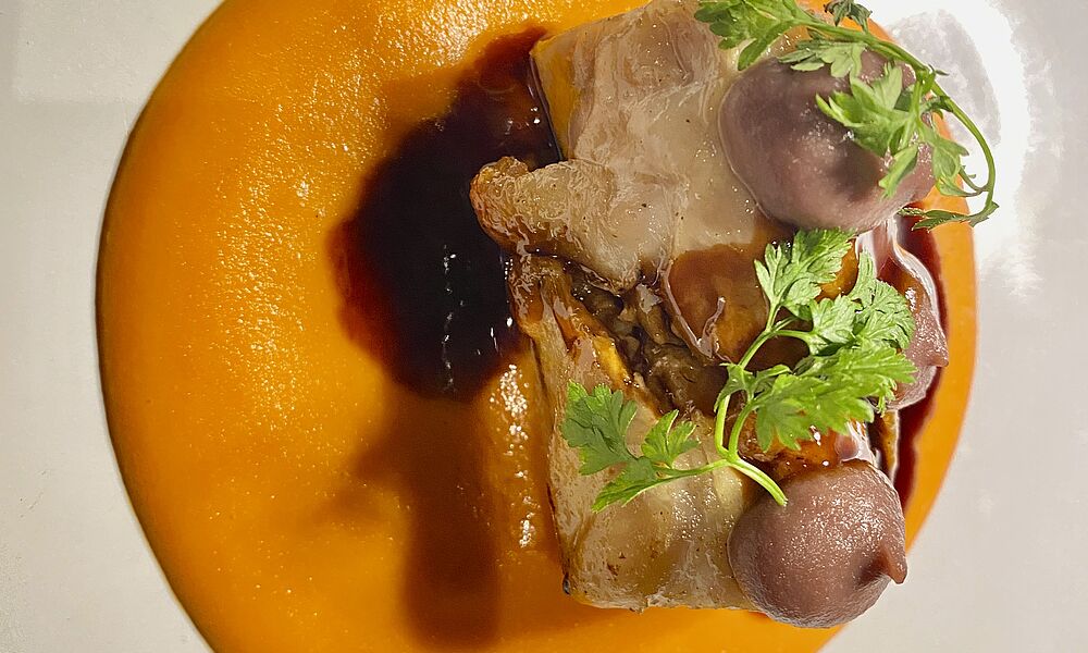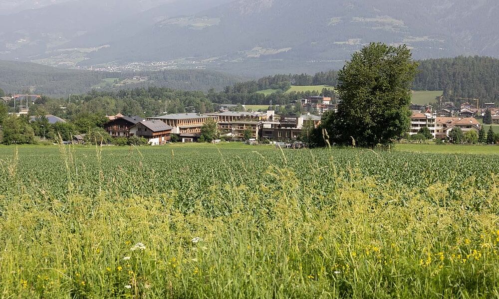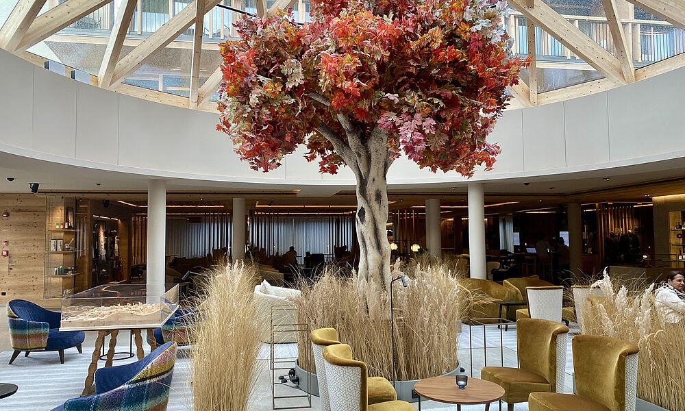 Gerade einmal drei Minuten dauert die Busfahrt von der Talstation Kronplatz in Reischach bis zum Hotel. Hier hat Stararchitekt Matteo Thun ein echtes Designjuwel entworfen, das schon von Weitem mit einer besonderen Holz-Architektur sichtbar ist. Beim Betreten grüßt ein leuchtend bunter Baum in der Mitte der Lobby, die mit erlesenem Samt-Gestühl ausgestattet ist. Gleich danach trifft man auf die gut sortierte Bar und das anschließende Restaurant mit „7Summit“-Konzept. Inspiriert von den höchsten Gipfeln Europas kombiniert man hier die traditionellen Gerichte dieser Regionen mit kulinarischen Highlights der Südtiroler Küche, sowie Gewürze und Aromen aus alpinen Regionen. Besonders die Nachmittagsjause wird gleichwohl von Skifahrern wie Golfern, Bikern oder Wellness-Fans hoch eingeschätzt, weil man auch in Bademantel oder Freizeitanzug erscheinen kann. Denn das Motto hier ist trotz 5-Sterne Luxus „leger“. Das Hotel versteht sich als Sportler-Heimat und das merkt man auch in den 97 Zimmern und Suiten, wo schon die Yoga-Matte, die Sprossenwand nebst Hanteln und Medizinball wartet. Das schmälert bestimmt nicht den Wohlfühlaspekt und das nach den Jahreszeiten farblich angepasste Interieur tut noch das Seinige dazu. Wir wohnten in Grün und wurden mit Golfschläger-Dekor in den Etagen stets auf unser Hobby hingewiesen. Aber ein „Experience Concierge“ berät Sie darüber hinaus noch über weitere Sportmöglichkeiten.