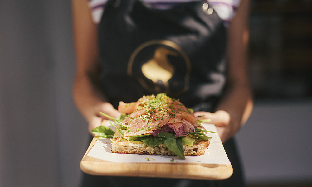 Beim Bummel über die Westerländer Promenade zieht der Duft von Gebackenem in die Nase. Er stammt aus dem Surf-Deli „Zur Goldenen Möwe“ . Spezialität ist Foccacia, das spannend von Küchenchef Carl belegt, frisch aus dem Ofen kommt. Manch Möwe lauert auf den delikaten Happen. Im „Käseklub Keitum“ dagegen, ex Friesisches Käselädchen, muss man keine gefiederten Brötchendiebe fürchten. Hausherr ist der fröhliche Fabian Kolb, der sich seine Sporen im Bistro von Johannes King verdiente. Ob von Ziege, Kuh oder Schaf, viele Laibe stammen vom Backholzer Öko-Hof. Oberköstlich die friesische Tartilette. Auf der roten Bank am Feld niederlassen und beim Schnabulieren des geschmolzenen Snacks das landwirtschaftliche Flair inhalieren. Herrlich.