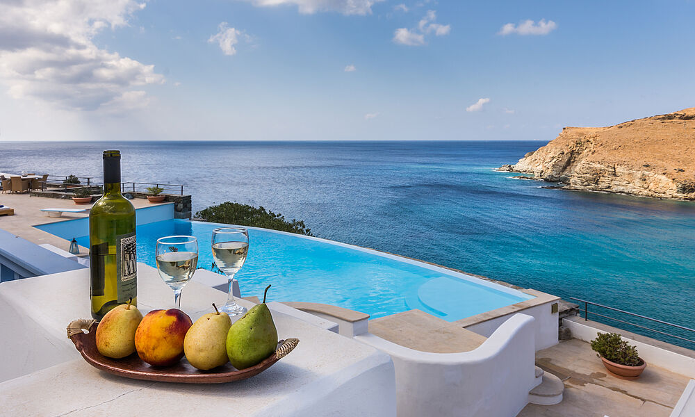 Klein ist die Insel tatsächlich, ganze acht mal 16 Kilometer in der Fläche. Sie wird von 25.000 Seelen bewohnt und verfügt über ein eher bescheidenes Netz von engkurvigen Straßen, manche aus Schotter. Die junge Griechin ist Inhaberin des B&B-Hotels Pino di Loto. Der Name ist ihrem Großvater gewidmet. „Im Schatten der Pinie genoss er den Nachmittag“. Der knorrige Nadelbaum steht noch, umzingelt von Steinbecken. Zu Opas Zeiten wurde darin Wein getreten, wie Terezdina erklärt. Die Hotelanlage mit sechs Suiten, zwei davon mit Mini-Pool, schichtet sich auf drei Terrassen über dem Fischerdorf Kini. Ein Träumchen in Schneeweiß, ausgestattet mit Naturmaterialien des griechischen Produzenten Coco-Mat. Die schmale Straße hinunter zu den beiden Sandstränden eignet sich nicht unbedingt für kaputte Knie. Doch der Blick in zauberhafte Gärten lenkt vom Schmerz ab. Darin reifen Granatäpfel und Trauben, Oliven und Zitrusfrüchte. Bougainvilleas setzen dicke Farbtupfer.