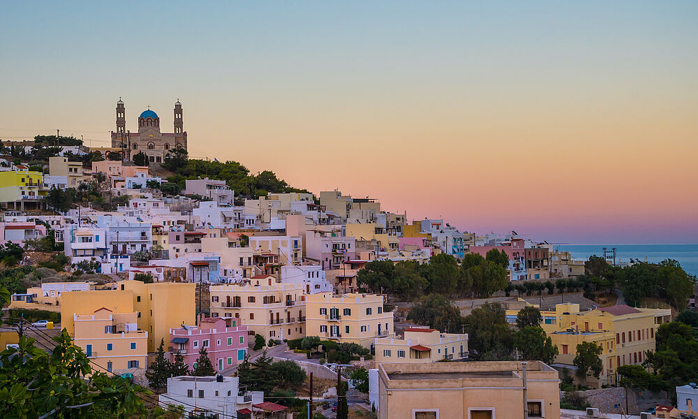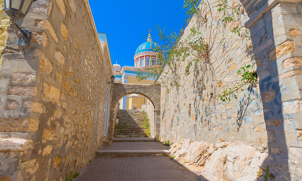 Nun ja, denkt man, von der Fähre betrachtet sieht Syros auch nicht viel anders aus als das benachbarte Mykonos oder Paros: Felsen eben und dazu karge Hügel. Ein echter El Greco soll dort zu bewundern sein? Das hatte mir zumindest jemand ins Ohr geflüstert. Doch dann legt sich das Schiff in die Kurve, läuft in die weite Bucht von Ermoupoli ein. Und man staunt: Das Städtchen rankt sich über zwei Hügel, jeder von einer mächtigen Kathedrale gekrönt, zu Füßen farbenfrohe Bauwerke im neoklassischen und venezianischen Stil. Säulen, Bögen und Balkone schmücken die Häuser. Eine kolossale Kuppel streckt sich gen Himmel, saphirblau schillernd wie ein Edelstein.
