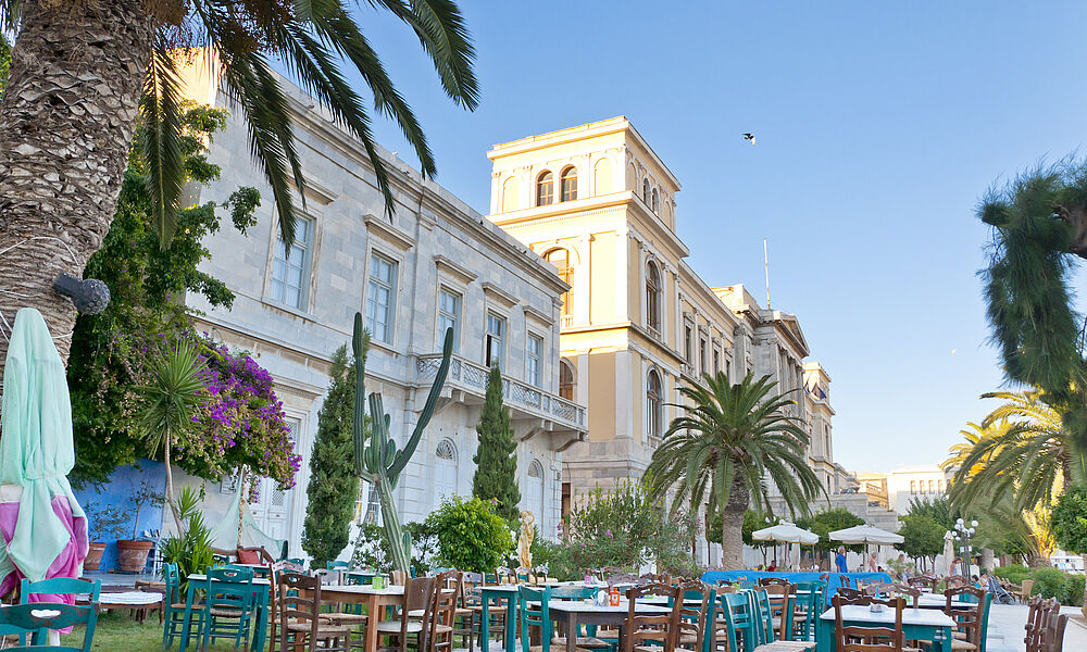 Doch bereits in der Antike war die Insel ein wichtiger Knotenpunkt mediterranen Handels. Als Syrii taucht sie sogar in Homers Odysseus auf. Ermoupoli indes entfaltete sich erst nach 1822. Das war eine Folge des griechischen Aufstands gegen die Türkenherrschaft. 5.000 Flüchtlinge, überwiegend von der Insel Chios, fanden hier damals eine neue Heimat. Die Menschen im 600 Jahre älteren Ano Syros empfingen sie mit offenen Armen. Zum einen, weil beide Gruppen dem katholischen Glauben anhingen – im Gegensatz zu griechisch-orthodoxen Gemeinden anderswo. Und zum anderen – und dabei spielt Weitsicht eine dominierende Rolle – weil die Neuankömmlinge Handwerk und Wissenschaften im Gepäck hatten. Klug gedacht, denn sie gründeten das erste Krankenhaus und das erste Gymnasium in Griechenland. Ebenfalls die erste moderne Werft, aus der dann auch das erste Dampfschiff vom Stapel lief. Zudem entstanden Webereien, Seifenfabriken und Gerbereien. Deshalb galt Ermoupoli, benannt nach Hermes, dem Gott des Handels, um die Jahrhundertwende auch als prachtvollste und eine der reichsten Städte des Landes. Bis heute ist Syros Verwaltungszentrum der Kykladen, die es kreisförmig umschließen. Und so wundert man sich, dass die Insel in Sachen Tourismus eher ein Gänseblümchen-Dasein fristet. Ein entzückendes allerdings.