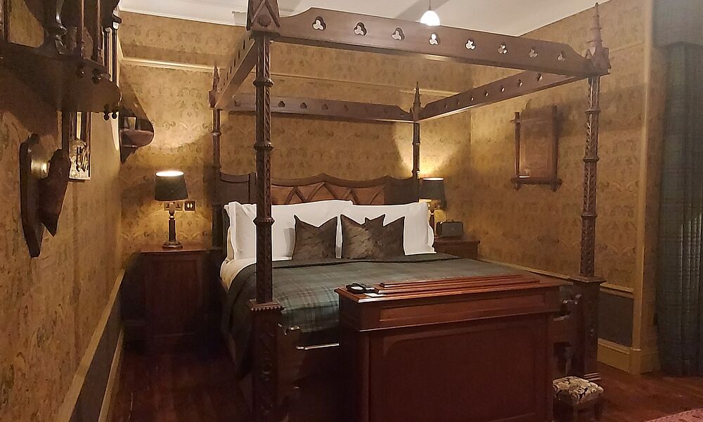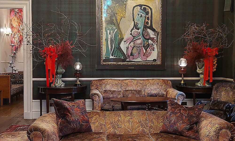 Spätestens am zweiten Tag, wenn man die zauberhafte Atmosphäre des Hotels tief inhaliert hat, spürt man, dass das Fife Arms im schottischen Hochland ein ganz besonderes Juwel ist. Romantische Gemüter werden dem Flair sofort verfallen. Andere brauchen etwas länger, um vollständig wahrzunehmen, welche Schätze das museal wirkende Innenleben birgt. Moderne und antike. Insgesamt sollen es 16.000 Teile sein, die sich über Lounges und Restaurants, Bars und Meeting Rooms, Gänge, Treppen und Zimmerfluchten verteilen. Jedes Teil hat seine eigene Geschichte. Das reicht von Picassos und Brueghels über eigens designte Tapeten und Stoffe im Tartan- Muster bis zu Vitrinen mit alten Waffen. Und last not least bis zur lebensgroßen Wachsfigur von Queen Victoria. Sie versteckt sich in der oberen Etage. „Creepy“, schrie ein kleiner Junge, als er sie entdeckte. Irgendwie schwebt der Geist der Royals überall. Kein Wunder, Balmoral Castle liegt nicht weit entfernt. Dicht am 600-Seelen Dorf erstreckt sich ein königlicher Forst und wenn man Glück hat, begegnet man dort King Charles beim meditativen Spaziergang. Sicher ist, dass sich zu den Highland Games in Braemar ein geraumer Teil der royal Family versammelt.