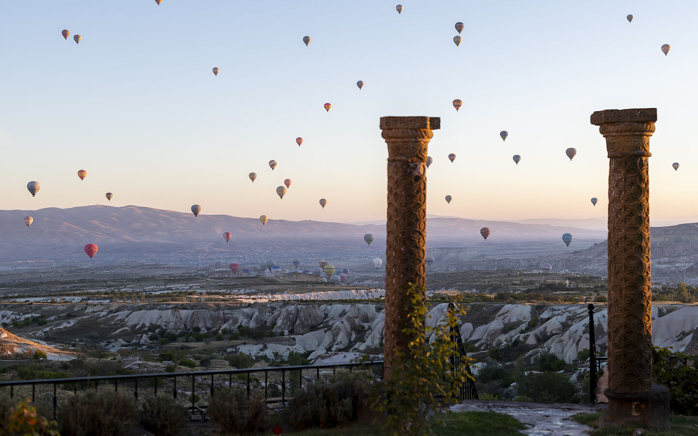 Wenn bunte Heißluftballons über die Vulkanlandschaft Kappadokiens schweben und der Himmel in Orange und Rot leuchtet, wirkt die Szenerie fast unwirklich. Vom Relais & Châteaux Museum Hotel in Nevsehir lässt sich dieses Schauspiel dank milder Temperaturen bis in den November genießen. Das Haus ist mehr als eine Unterkunft: Ein lebendiges Museum mit über 30.000 Kunstwerken, historischen Höhlenbauten und dem größten Bodenmosaik der Welt. Zimmer mit Indoor-Pool, Steinwände, Teppiche und Kunstobjekte prägen das Design. Highlight ist die Dachterrasse mit Blick über das Tal.