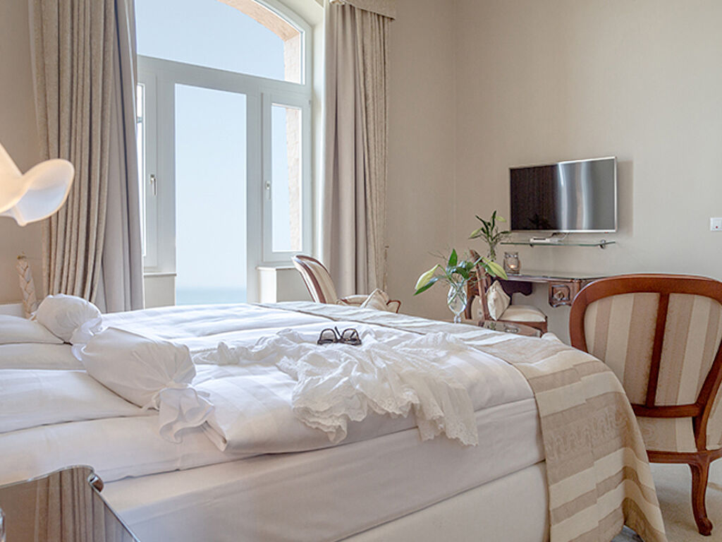 Nicht nur die individuell gestalteten Zimmer, von denen keines dem anderen gleicht, wissen zu bezaubern. Auch der Blick aufs Meer ist Luxus pur. Aufstehen und das Meer sehen, das ist der Inbegriff von Urlaub. Nach dem Frühstück macht es sich der urlaubshungrige Gast in einem der Strandkörbe auf der Hotelterrasse gemütlich und lässt die Seele beim Möwenbeobachten und Meeresrauschen-Lauschen baumeln.