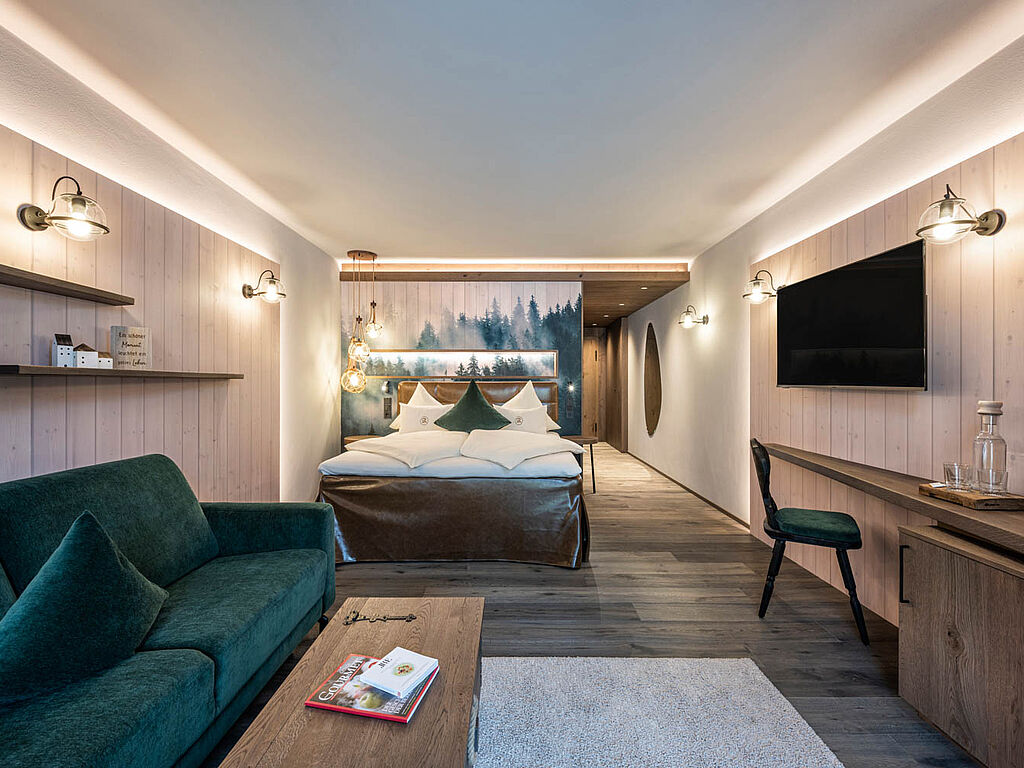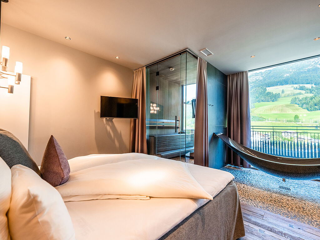 Viel Liebe wurde in die Auswahl von natürlichen Materialien, Stoffen und Farben gesteckt. Das absolute Highlight sind die exklusiven Luxury Spa Penthouse Leogang Suiten mit Sauna und schwebender Badewanne!