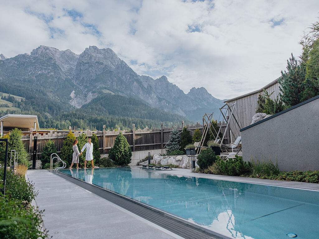 In sensationeller Lage mit Blick auf die Leoganger Steinberge bietet die Riederalm vom ersten Thermalpool der Region, Mountain SPA exklusiv für Erwachsene, extra Family SPA, zwei Pools à 20m bis zu genialen Gourmethighlights.