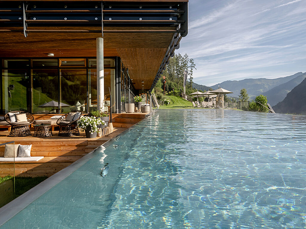 Ein auf 22 Meter erweiterter Infinitypool, der über die Geländekante hinausragt, ein innovatives Schaum-Dampfbad sowie ein Kaltwasserbecken mit Wasserfall und ein Whirlpool sorgen für außergewöhnliches Wellness-Erlebnisse. Hier lädt die Gastgeberfamilie Seer ein, das Fünf-Sterne-Hotel mit allen Sinnen zu erleben. Weil die Heimat im DAS.GOLDBERG wichtig und allgegenwärtig ist. Es muss nicht immer schneller, höher, weiter sein. Um Nachhaltigkeit noch weiter im Hotelkonzept zu verankern, geht es tiefer. Eine zusätzliche Wärmepumpe mit einer Tiefenbohrung von 6.000 Metern kühlt den Pool im Sommer und heizt ihn im Winter.